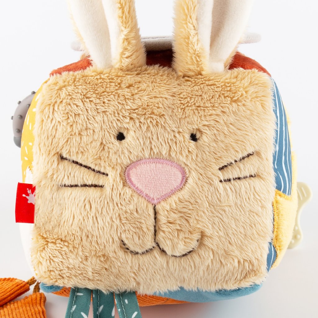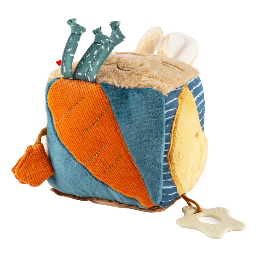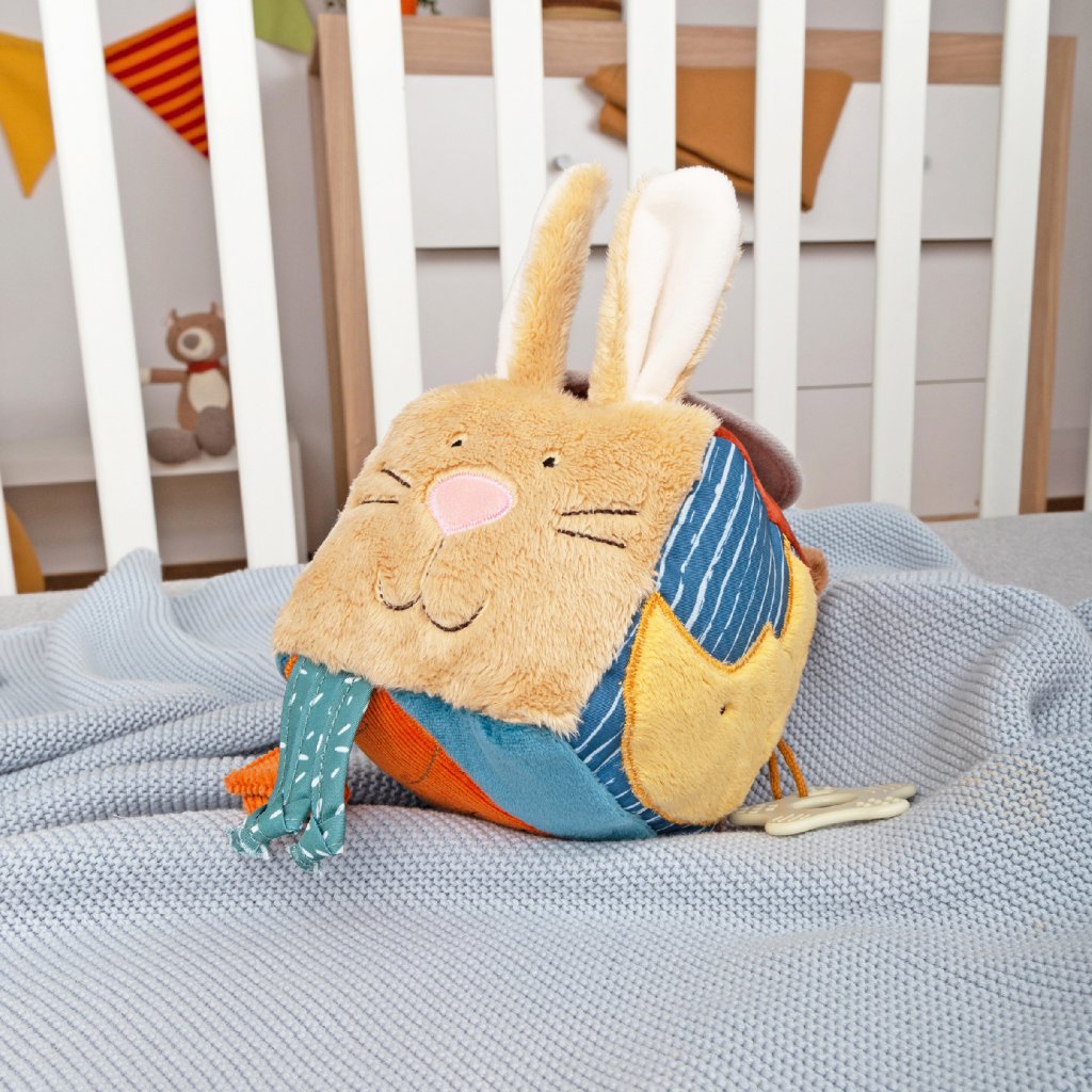 Hračka obsahuje pískátka, rolničku, šustící fólii, odnímatelné fóliové zrcátko na suchý zip a hvězdičkové kousátko. Aplikace zvířátek – králík, medvěd, husa, měsíc a mrkev – spolu s oušky a stužkami pro uchopení a cucání stimulují hru i objevování.
