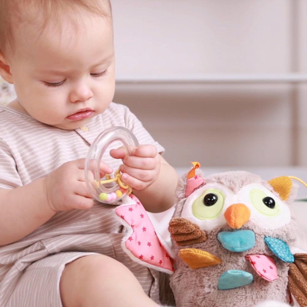 Veselý a barevný design s motivem sovy. Kombinace různých textur a výrazných barev činí hračku atraktivní a podnětnou pro malé děti.