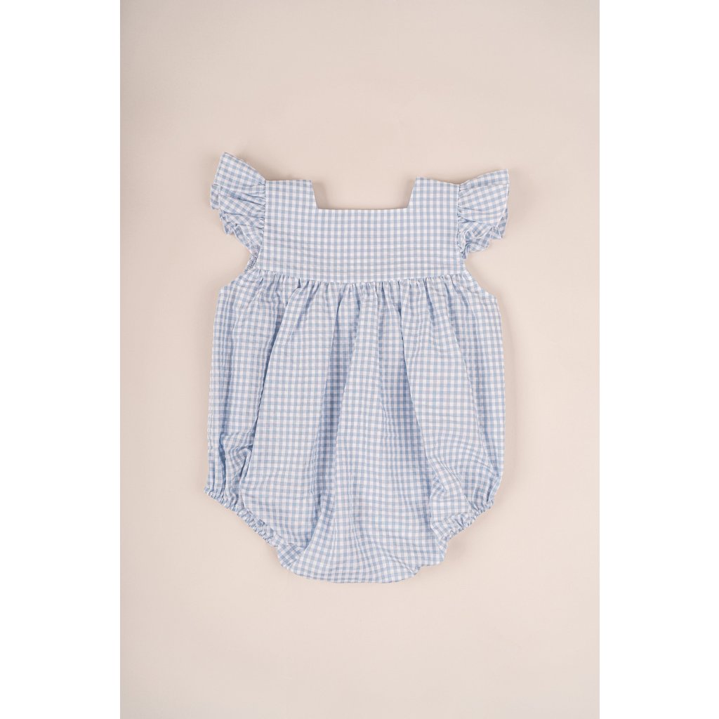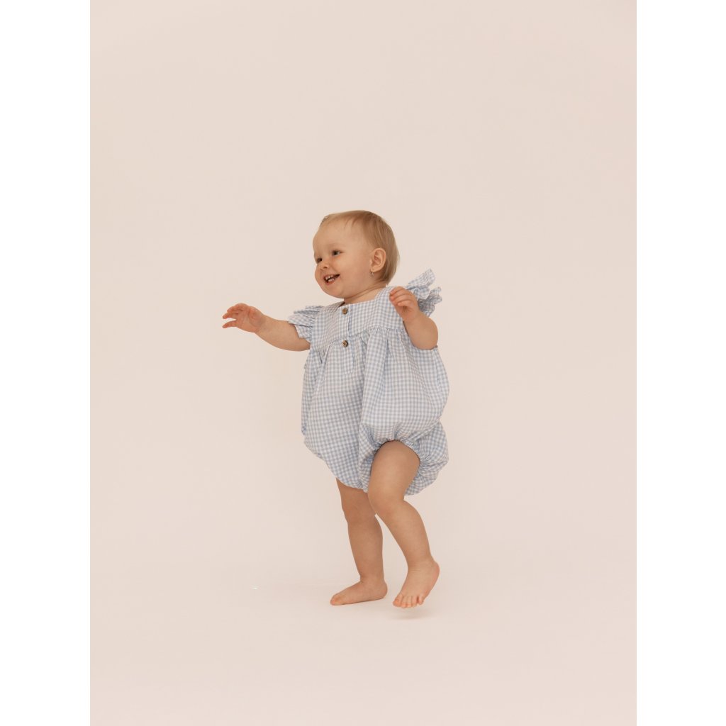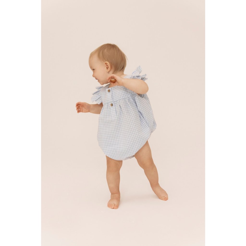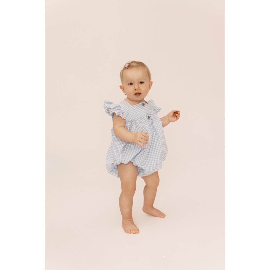Tento nadýchaný overal s romantickým volánkem a jemnou kostkou v pastelově modré je ušitý z kvalitní 100% bavlny. Poskytuje maximální pohodlí a volnost pohybu, zatímco promyšlený střih a zapínání usnadní každý přebal i převlečení.