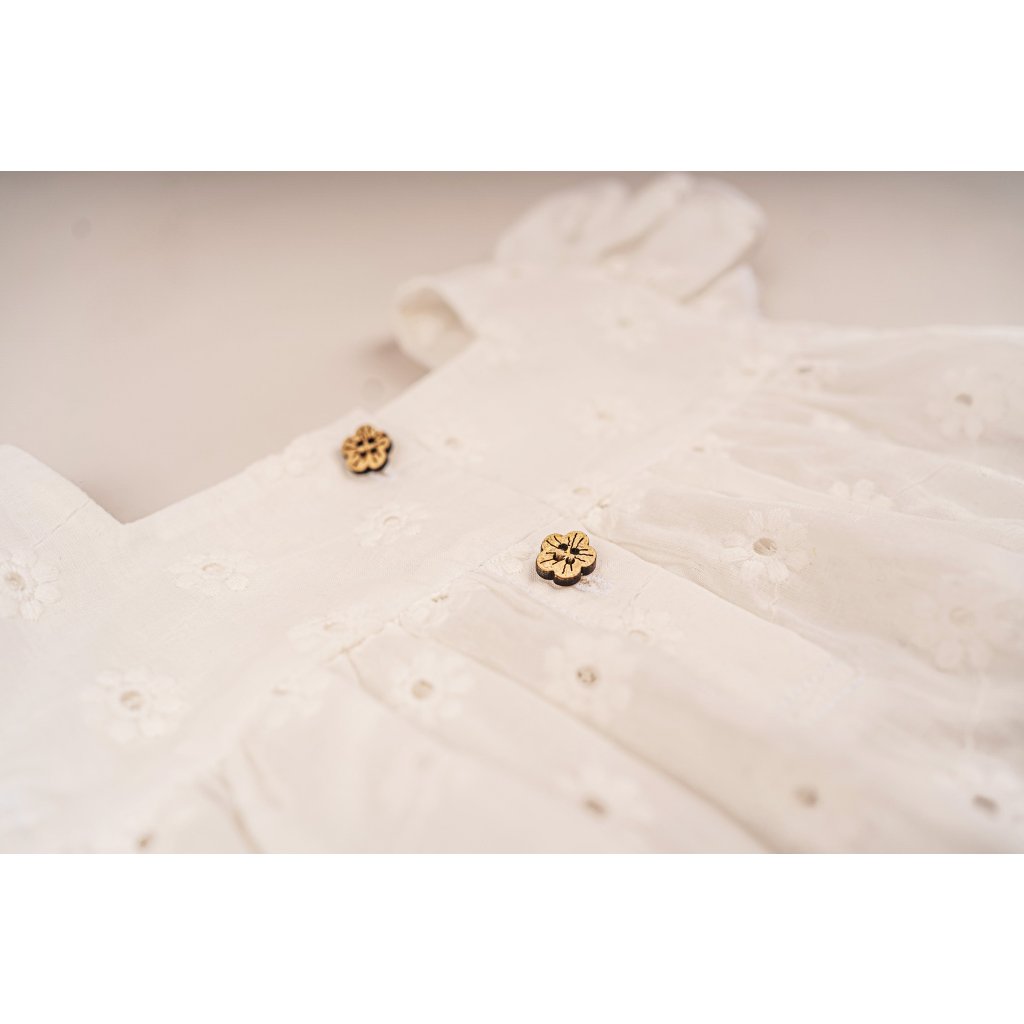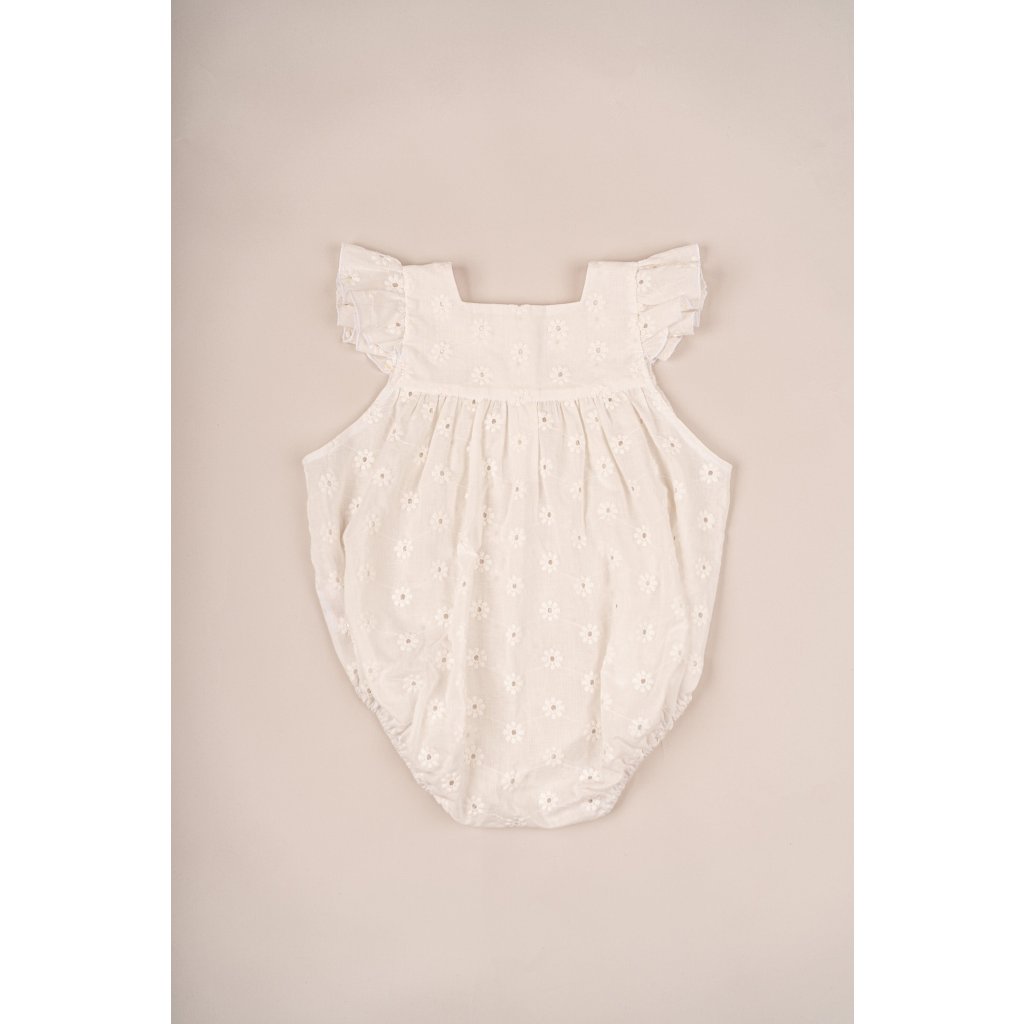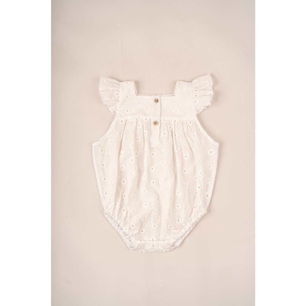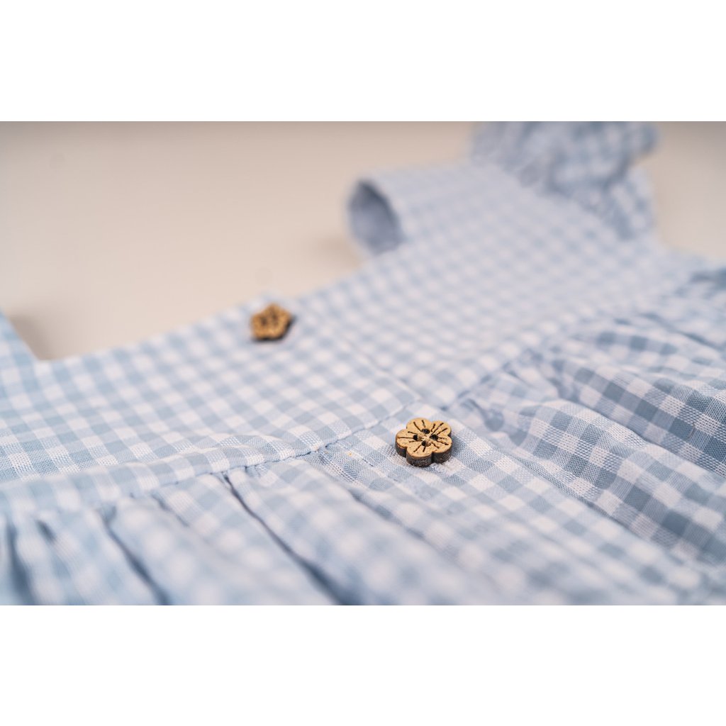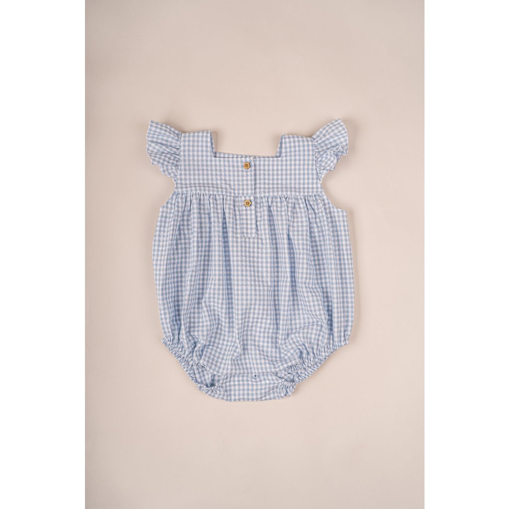 Tento nadýchaný overal s romantickým volánkem a jemnou kostkou v pastelově modré je ušitý z kvalitní 100% bavlny. Poskytuje maximální pohodlí a volnost pohybu, zatímco promyšlený střih a zapínání usnadní každý přebal i převlečení.