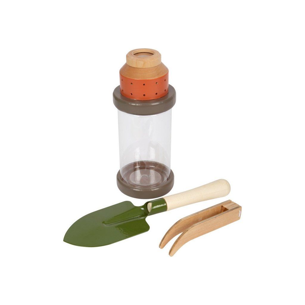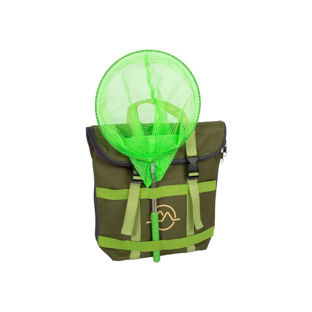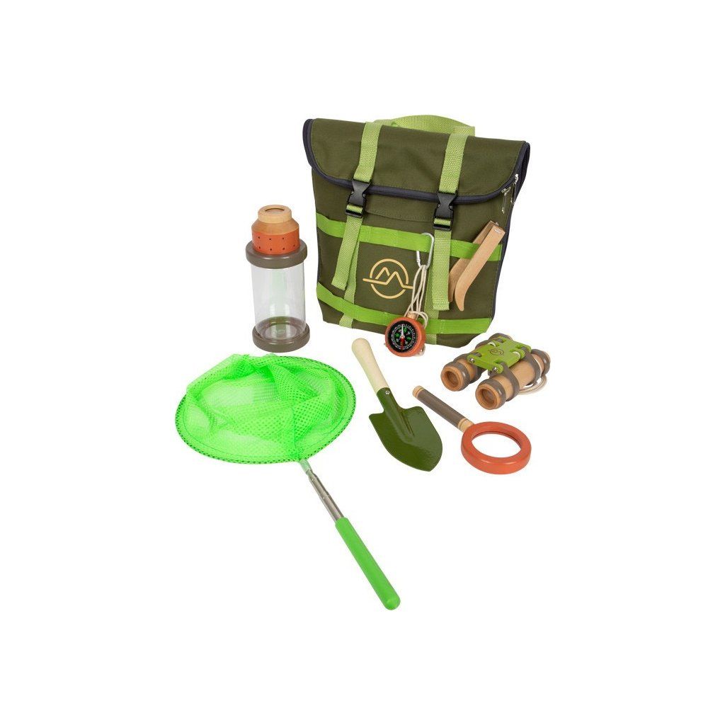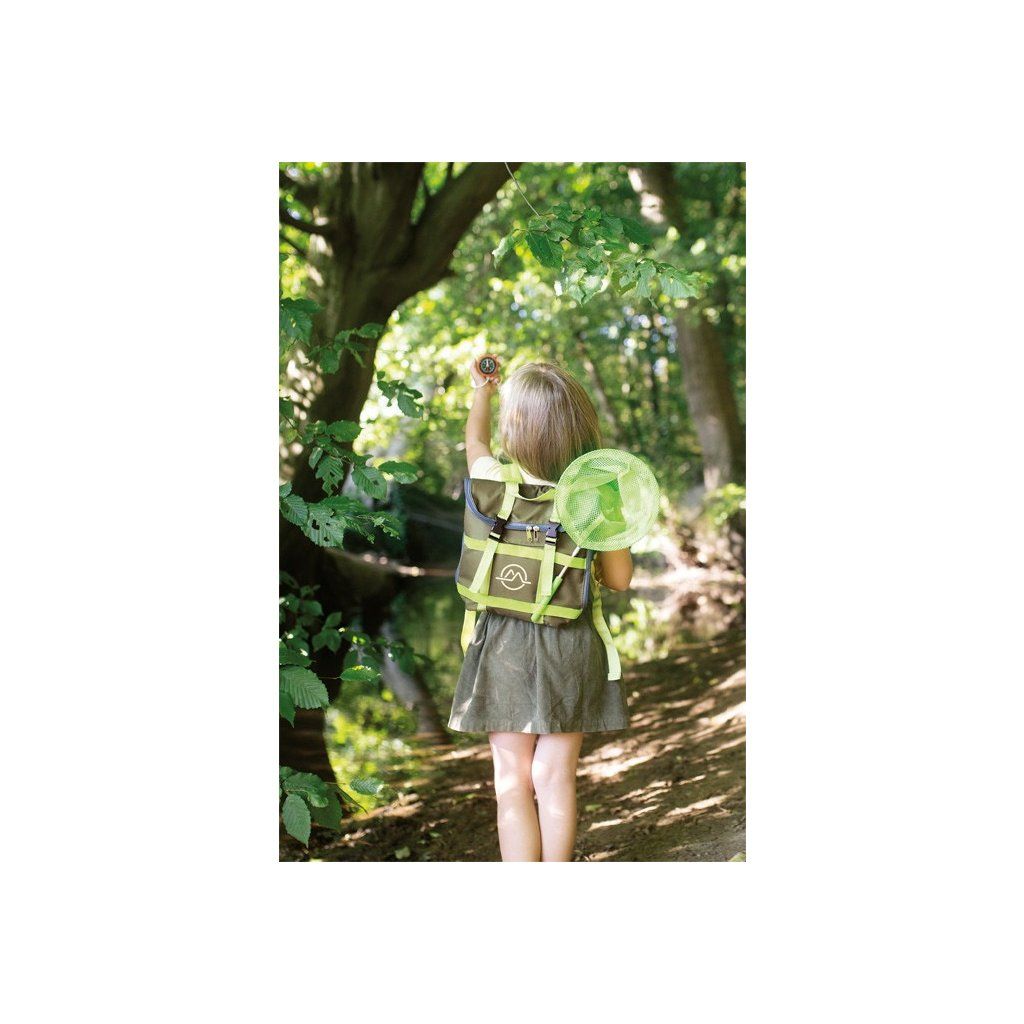 Pro milovníky dobrodružství! Tento odolný batoh se stane ideálním společníkem na cestách přírodou. Vejde se do něj pohodlně všechno vybavení: nádoba na hmyz se šroubovacím víčkem a integrovanou lupou, dřevěný dalekohled, síť na hmyz s teleskopickou tyčkou, kompas na šňůrce, lupa, pinzeta, lopatka, karabina. Na batohu je praktické, že jej lze díky zipu otevřít dokořán, má nastavitelné ramenní popruhy a mnoho poutek, na která můžete zavěsit vybavení.