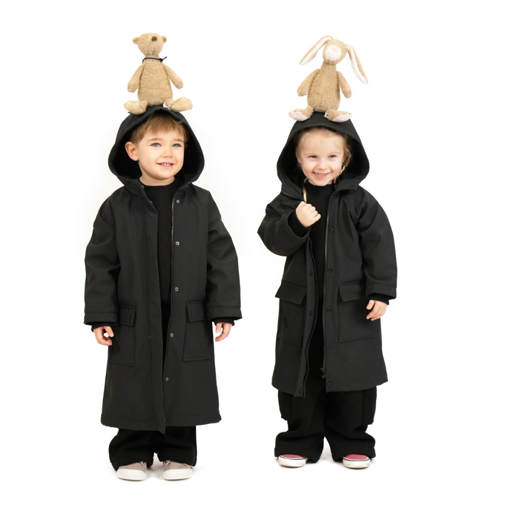 Kabát chrání před větrem a chladnějším počasím, má pohodlný střih a čistý nadčasový design. Zároveň jsme přidali detail, který si zamilují děti i rodiče – originální úchyt na oblíbeného plyšáka na zádech kabátu (viz foto). Plyšák tak může být stále s dítětem, ale ruce zůstávají volné.