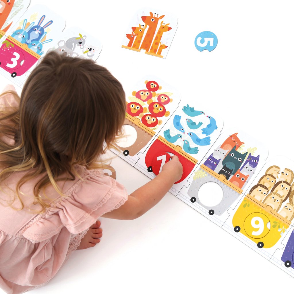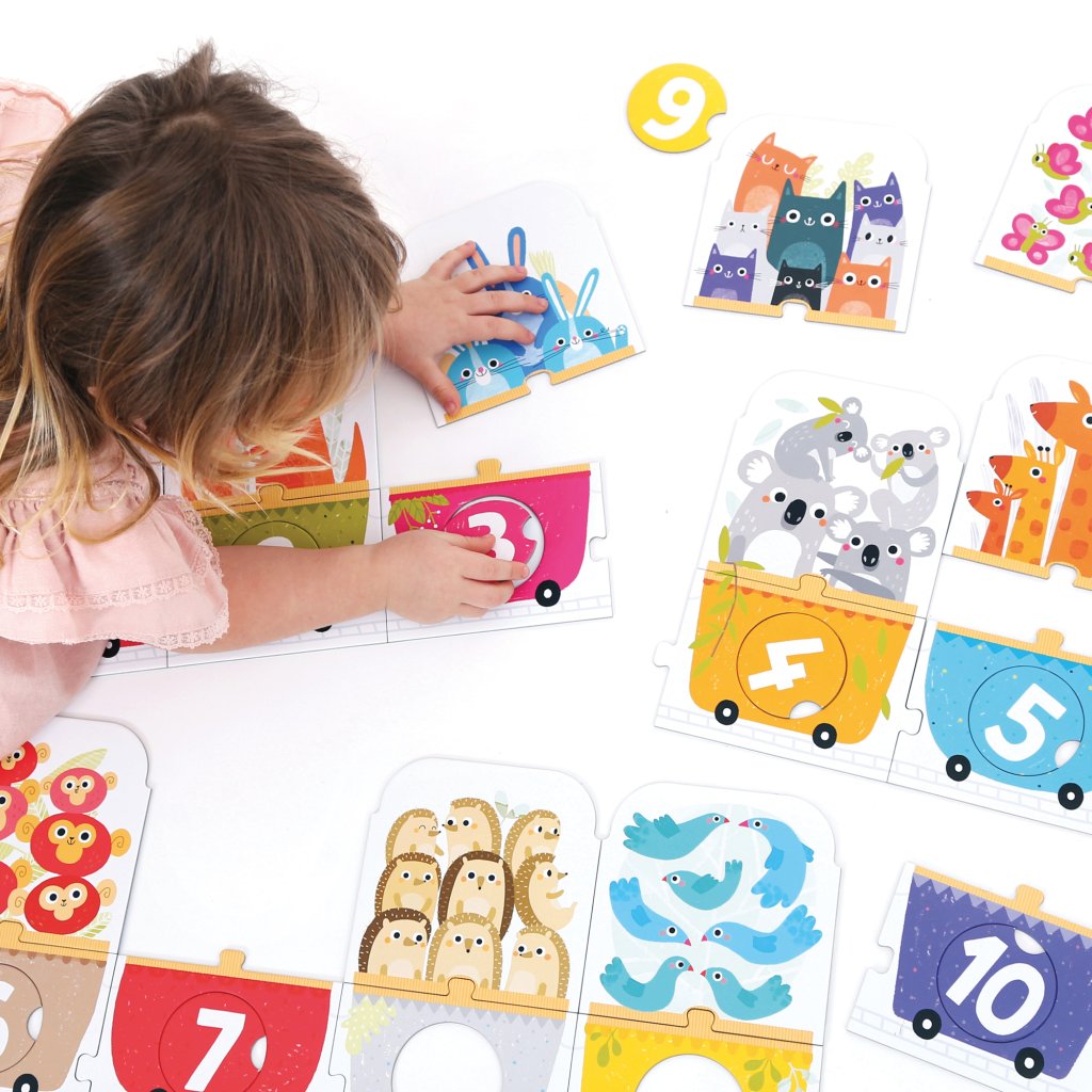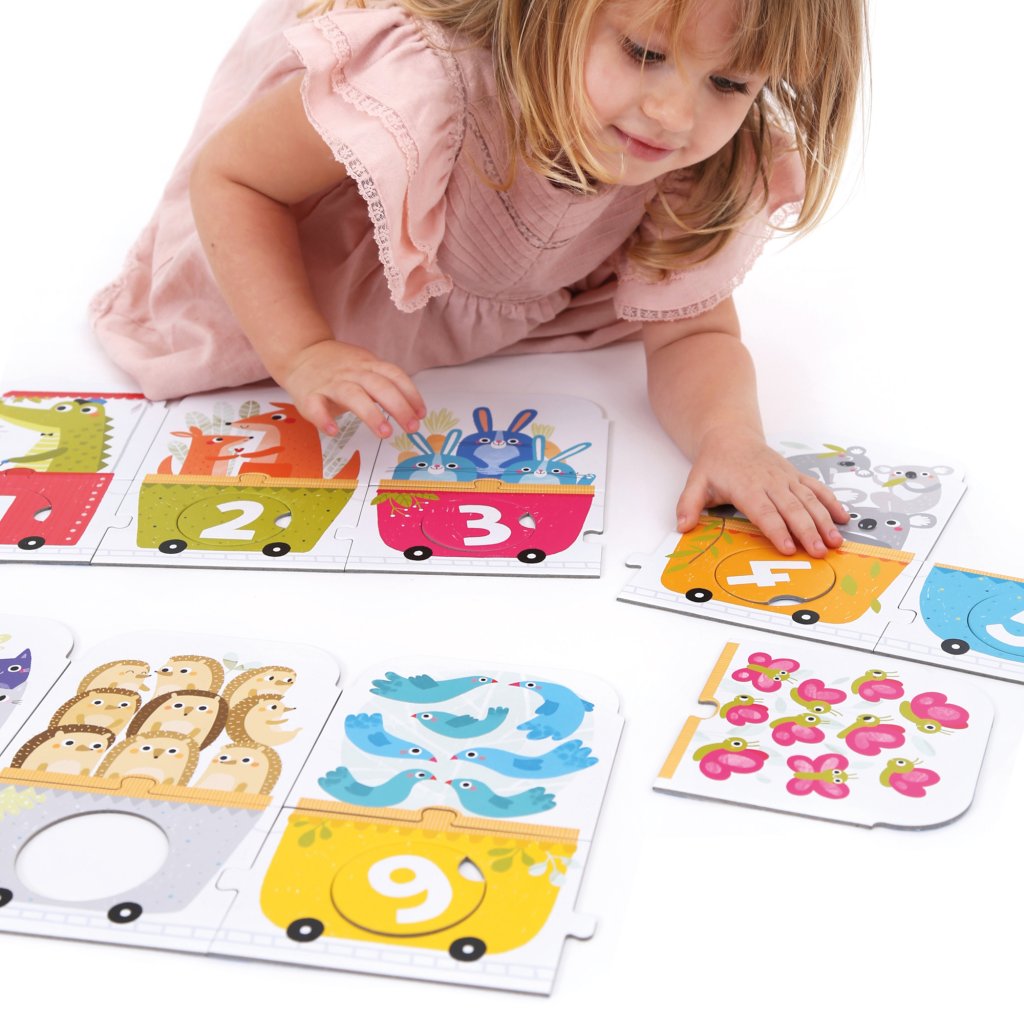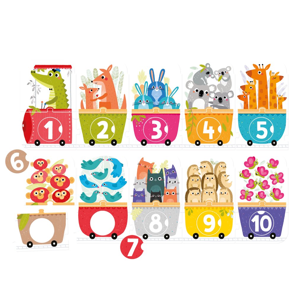 Skládání puzzle probíhá připojováním 30 velkých dílků, které tvoří vláček o délce 135 cm. Každý vagón obsahuje číslo a odpovídající počet ilustrací, což usnadňuje učení.