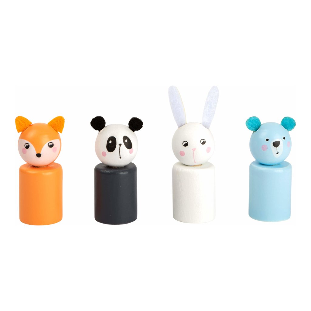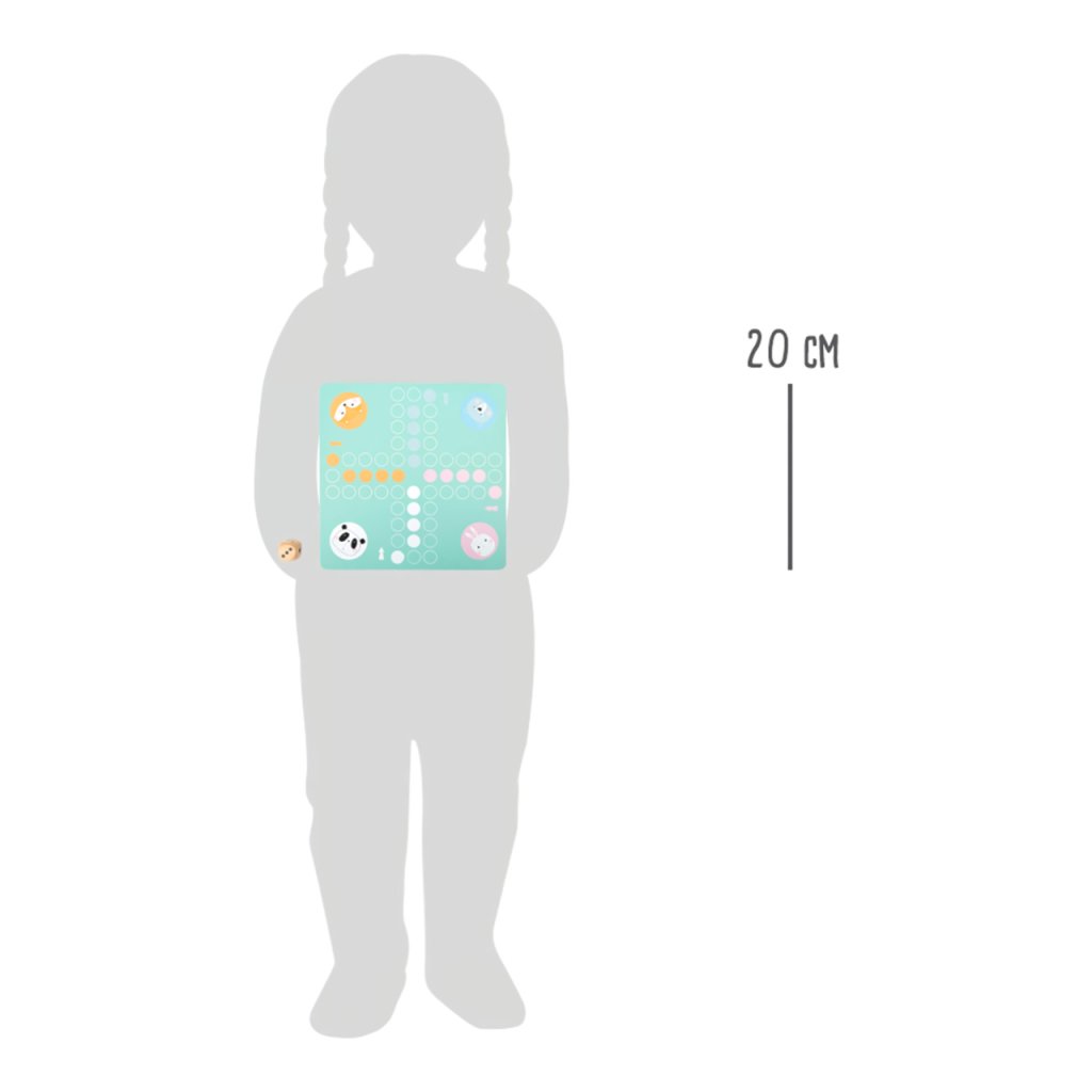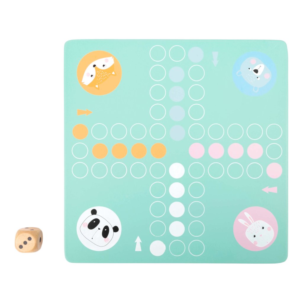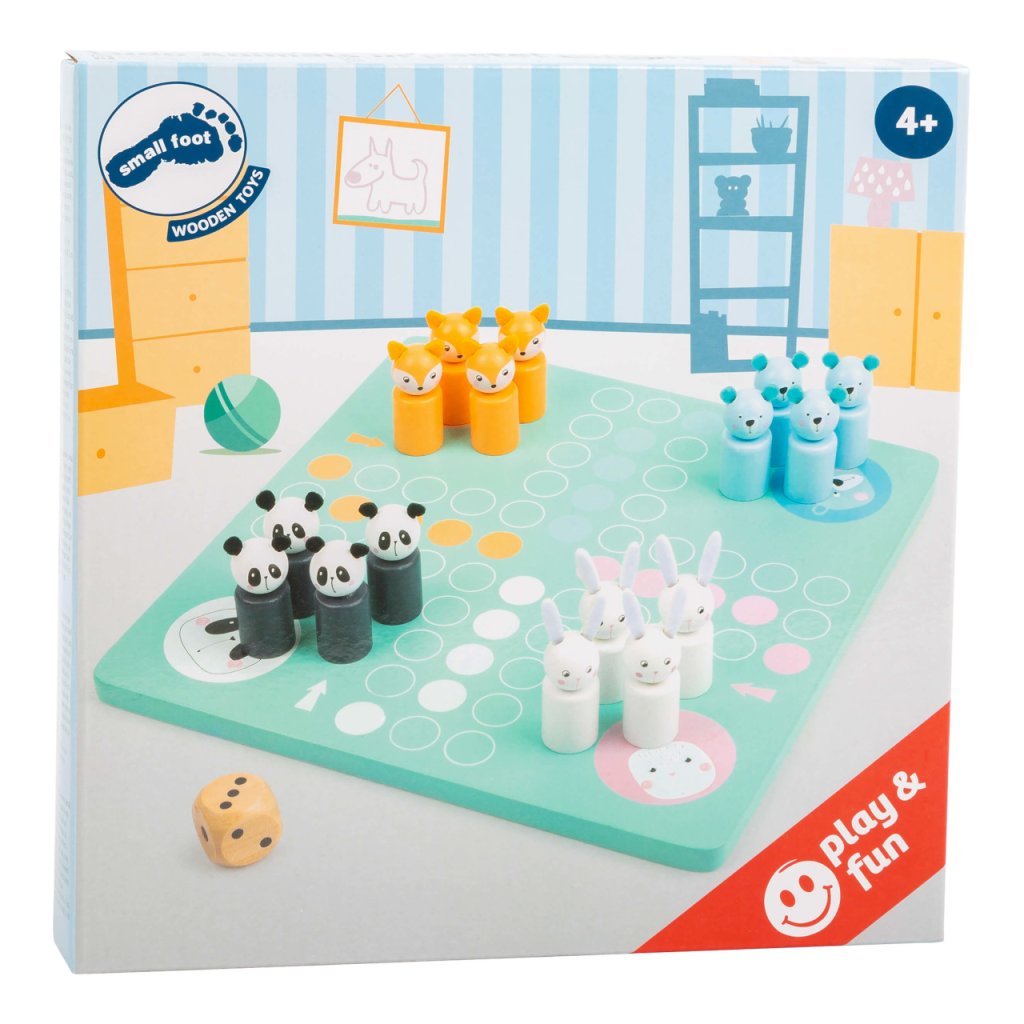 Které zvířátko se jako první dostane do svého domečku? Vyzkoušejte šikovnou hru v pastelových barvách s dřevěnými figurkami ve tvaru zajíce, pandy, medvěda a lišky. Hod kostkou udává, kolik kroků může daná figurka udělat.