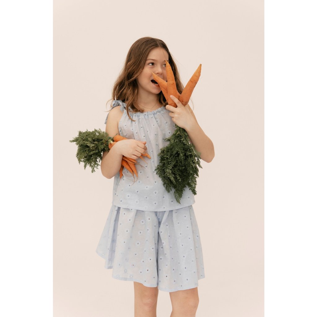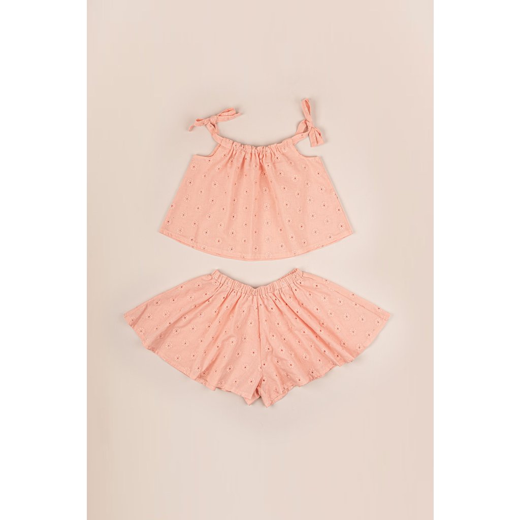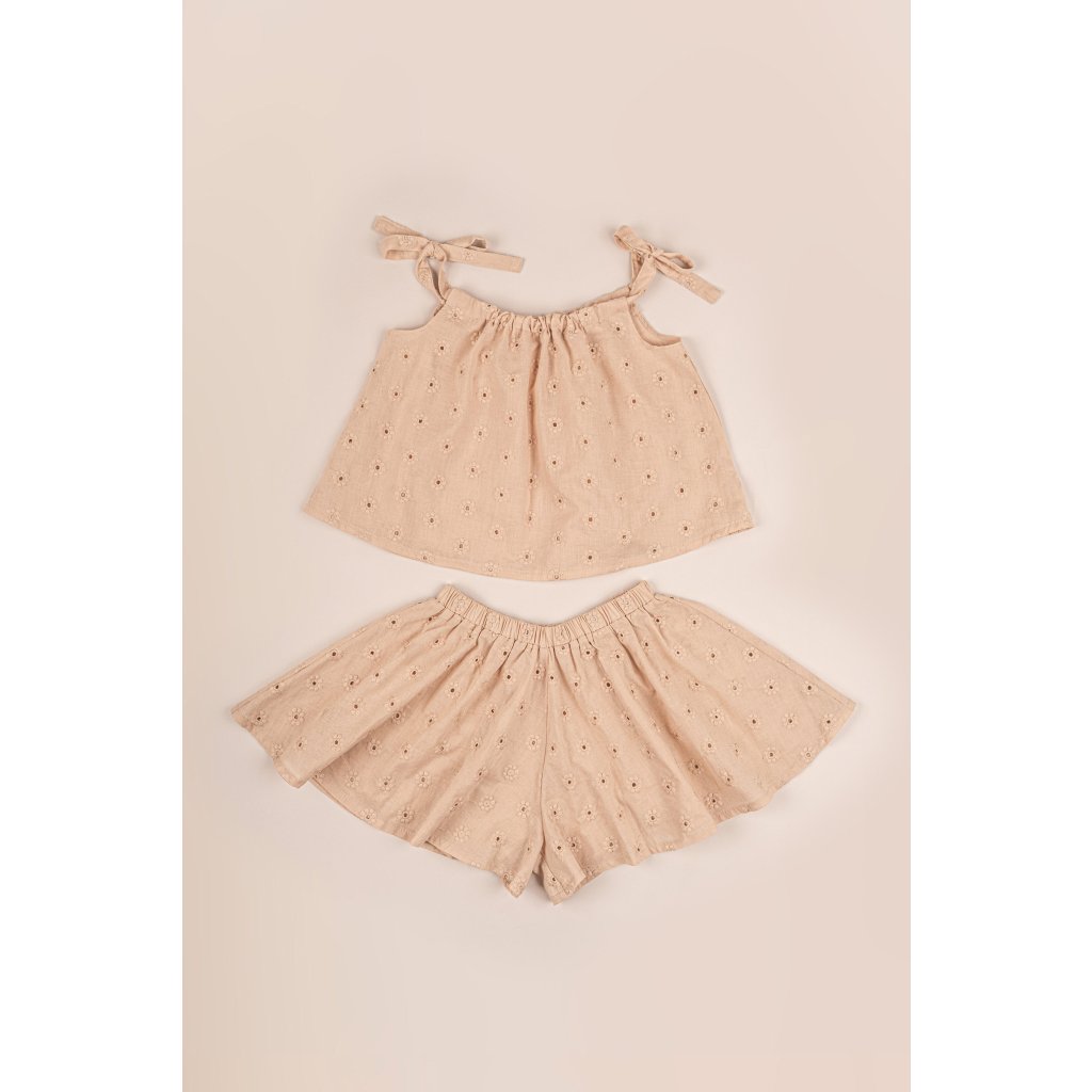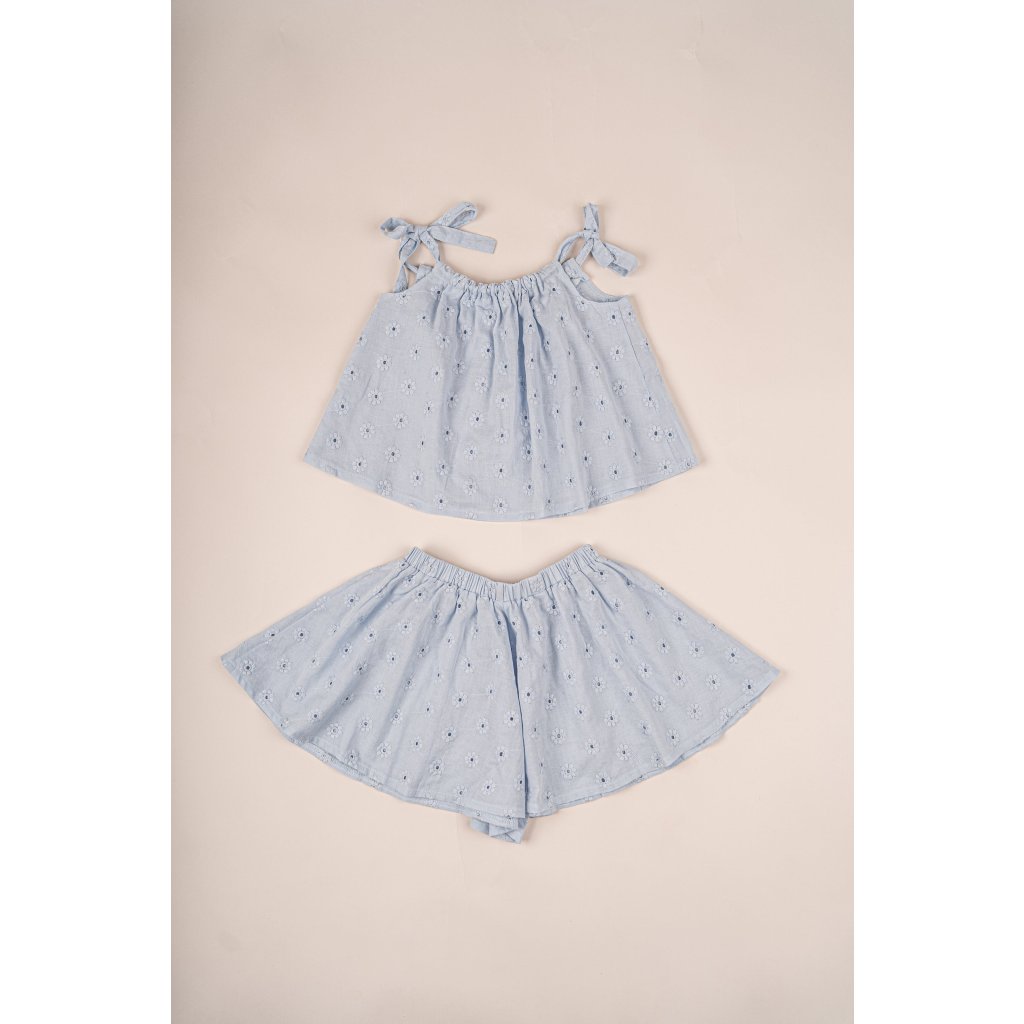 Tento kouzelný dvoudílný set je stvořený pro malé slečny, které milují volnost a pohodlí. Skládá se z lehkého tílka s nastavitelnými ramínky a širokých nabíraných kraťásků, které díky svému střihu působí jako sukénka.