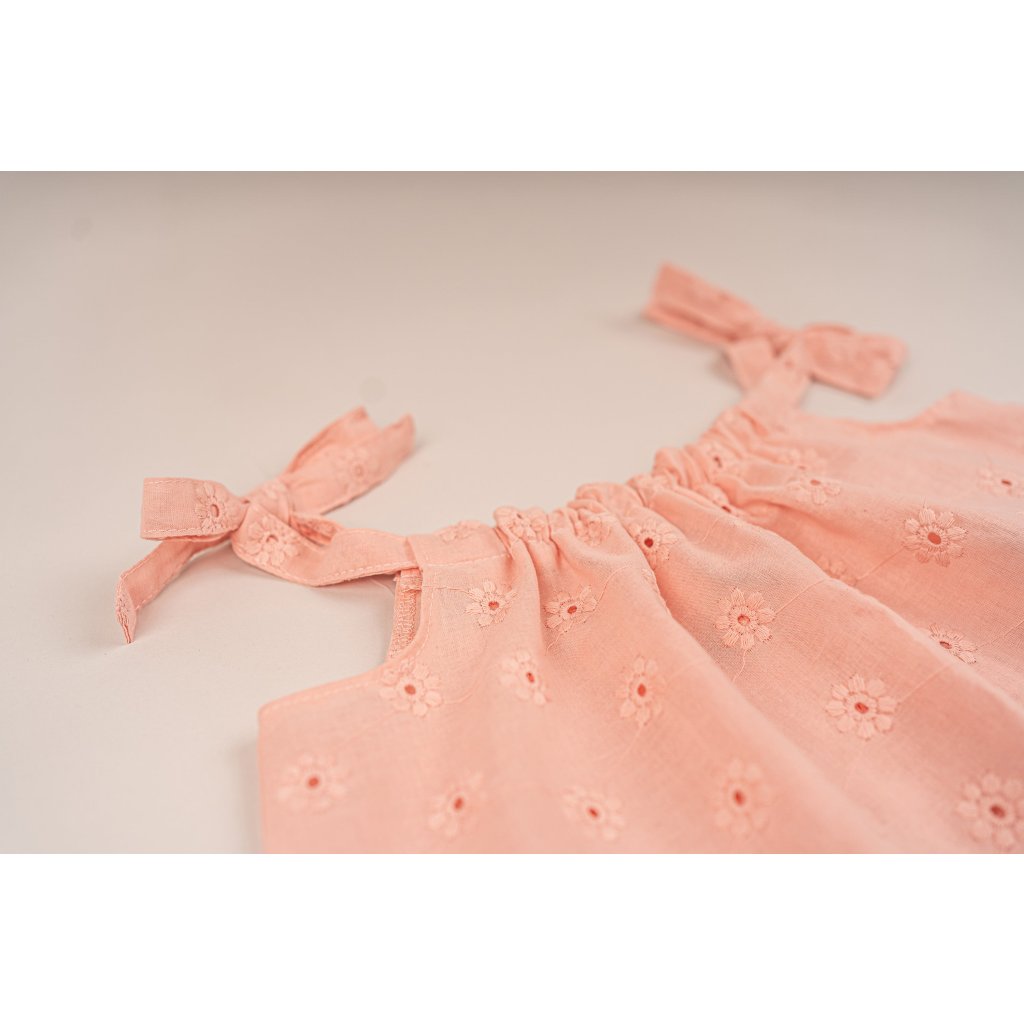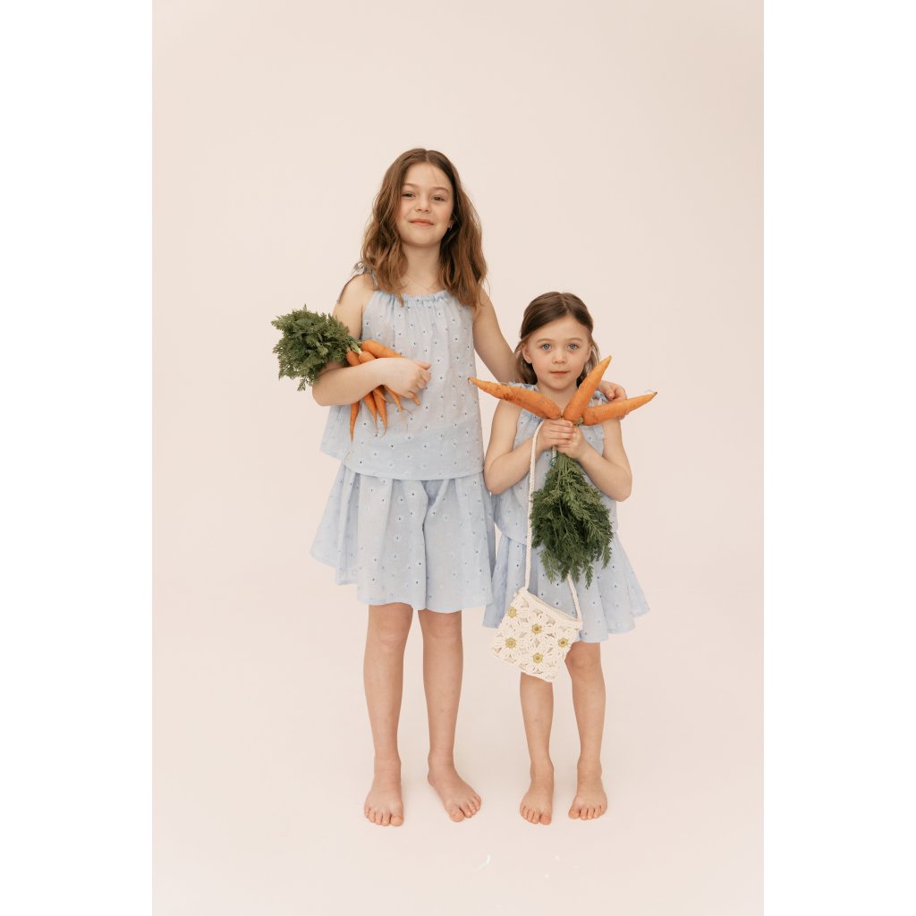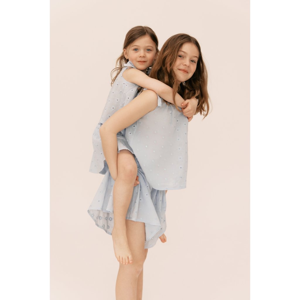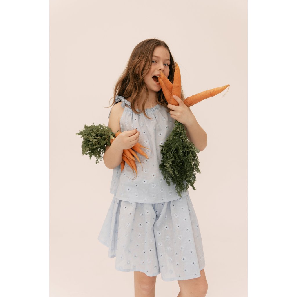 Tento kouzelný dvoudílný set je stvořený pro malé slečny, které milují volnost a pohodlí. Skládá se z lehkého tílka s nastavitelnými ramínky a širokých nabíraných kraťásků, které díky svému střihu působí jako sukénka.