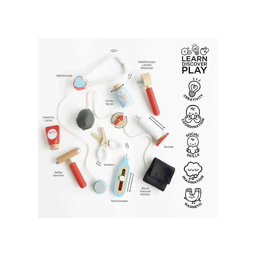 Sada pro mladé lékařky, záchranáře a zdravotní sestry! Genderově neutrální hračka pomůže s rozvojem jemné motoriky a zručnosti. Skládá se z vintage textilní brašny s dřevěnými uchy a pevným dnem a 9 doplňků, mezi které patří stetoskop, teploměr, injekční stříkačka, nůžky, mast a další. Hra na role nikdy nebyla zábavnější! Dětem můžete vytisknout a vystřihnout speciální kartičky s „lékařským předpisem“. Hračky s účelem Všechny hračky firmy Le Toy Van jsou vyrobeny s cílem – aby dlouho vydržely. Designovány s láskou zkušenými řemeslníky za použití etických praktik a udržitelných materiálů, které jsou laskavější k naší planetě.