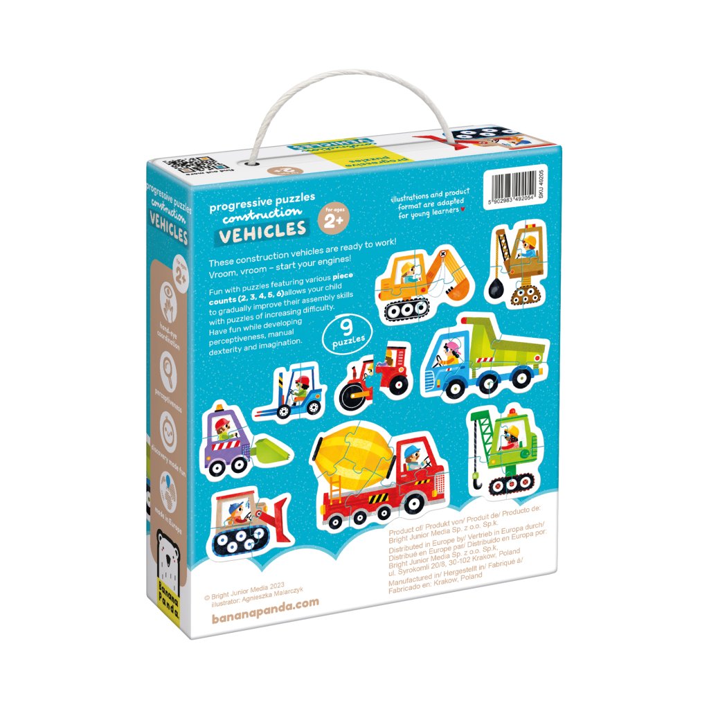 Sada Construction Vehicles obsahuje 9 samostatných puzzle s rostoucí obtížností. Dítě začíná skládáním jednodušších obrázků a postupně přechází ke složitějším.