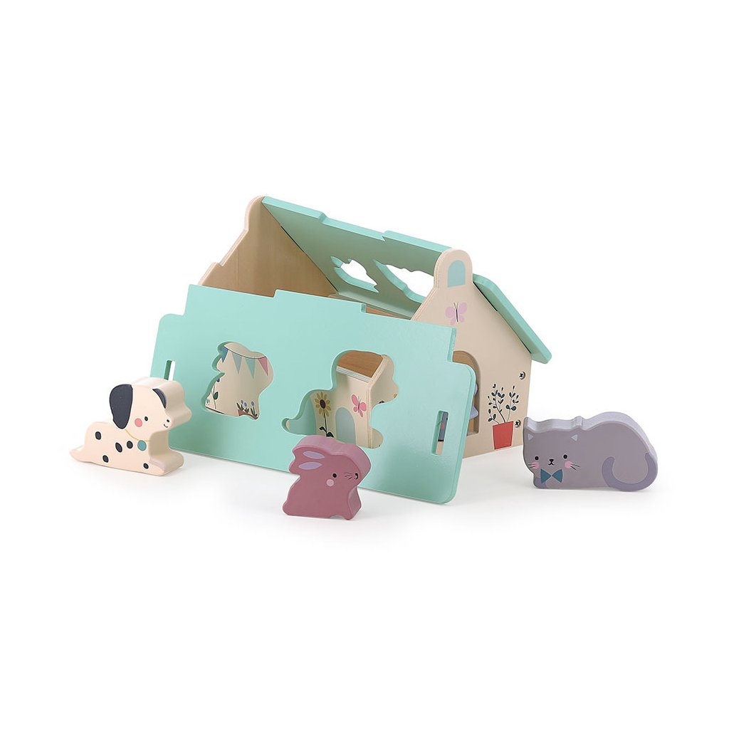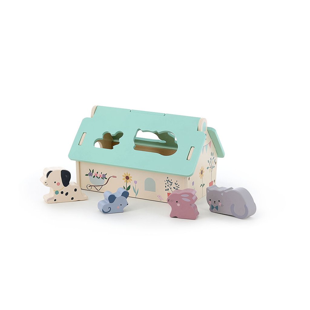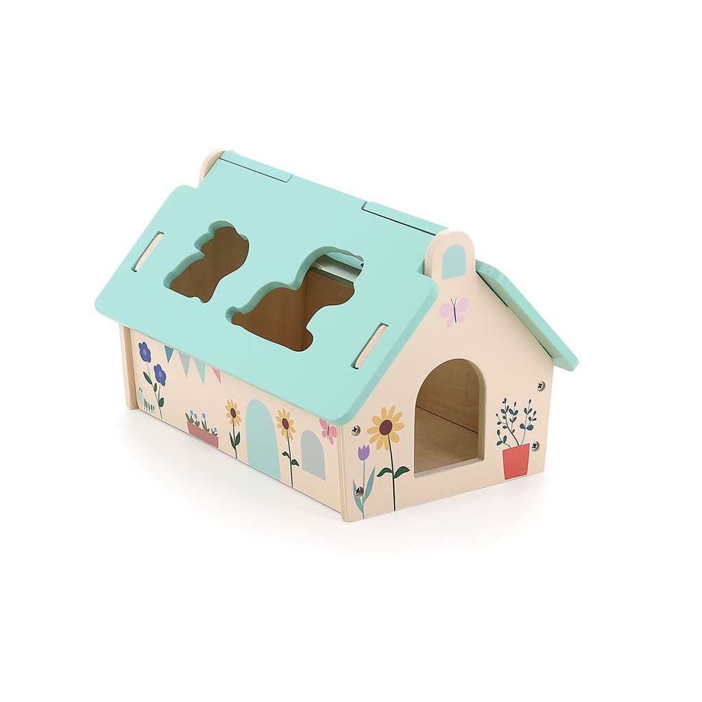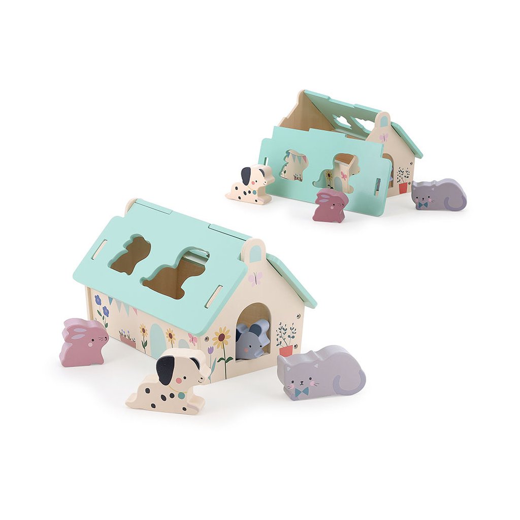 Kdopak bydlí v tomhle malebném domečku? Veselý pejsek, hravá myška, hebká kočička a skákavý králíček! Roztomilá dřevěná vkládačka podle návrhu ilustrátorky Sarah Betz vnese do dětských her kouzlo fantazie i učení. Domeček v jemných barvách s květinovými motivy má odnímatelnou střechu s otvory, do kterých děti vkládají zvířátka.