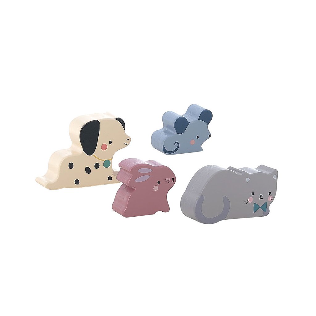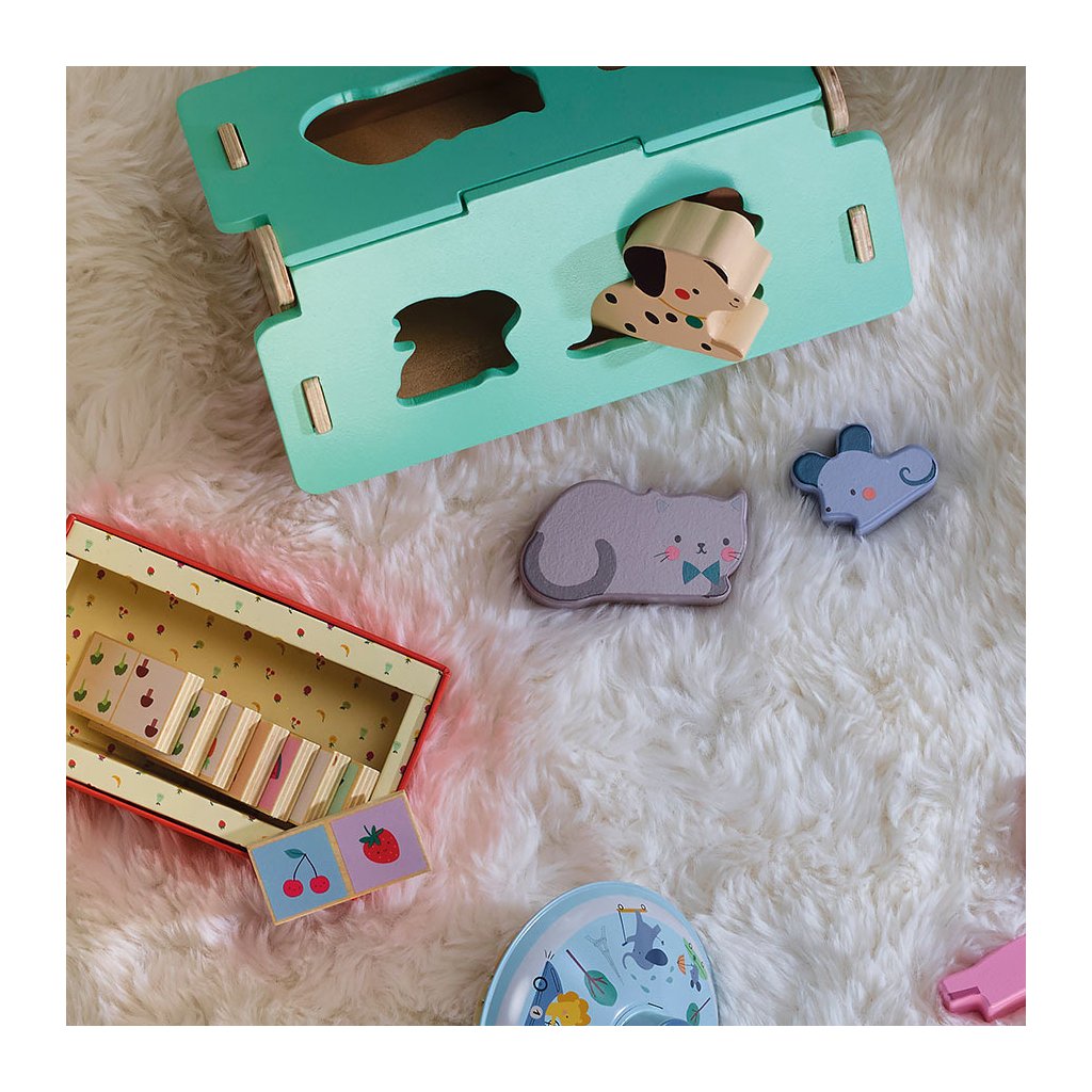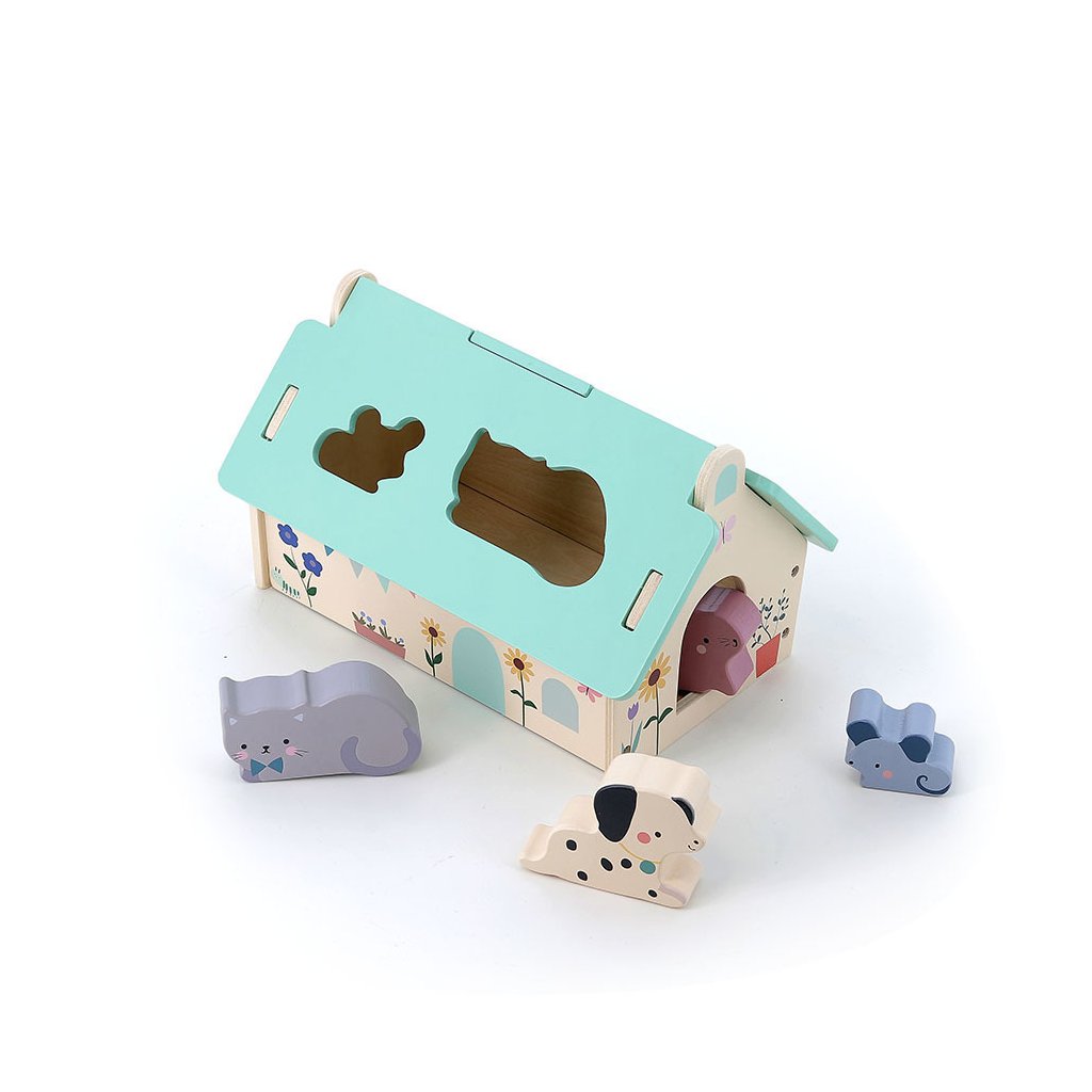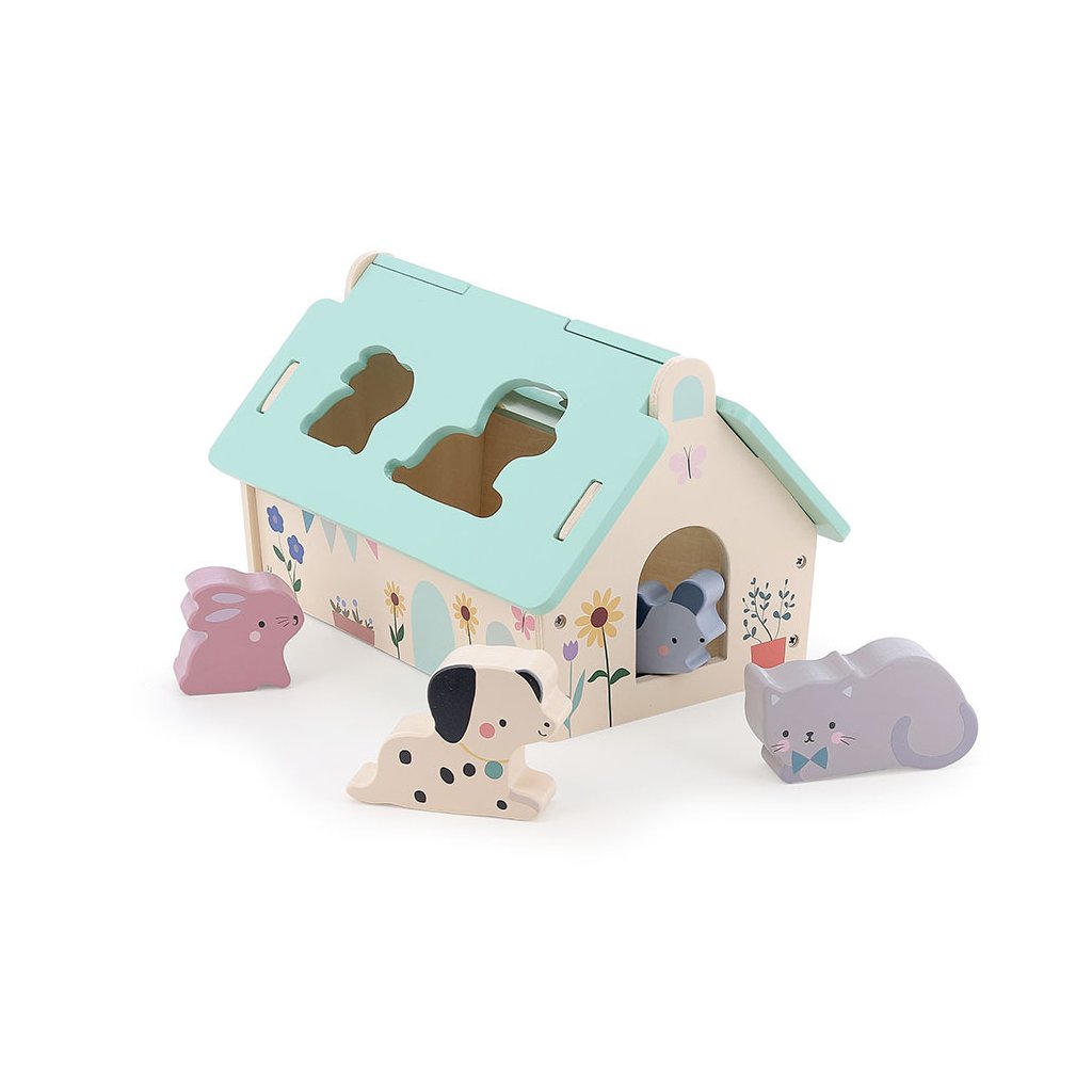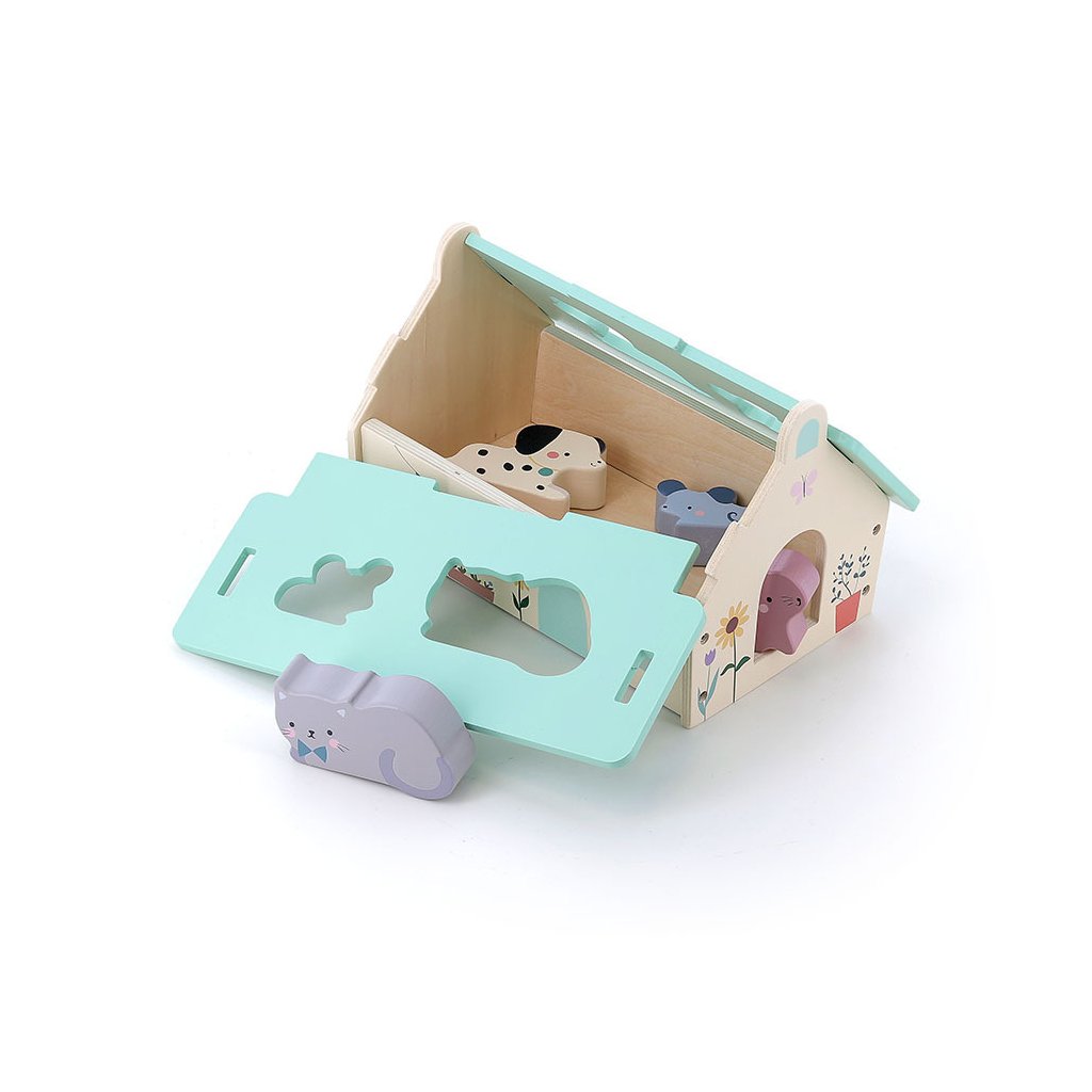 Kdopak bydlí v tomhle malebném domečku? Veselý pejsek, hravá myška, hebká kočička a skákavý králíček! Roztomilá dřevěná vkládačka podle návrhu ilustrátorky Sarah Betz vnese do dětských her kouzlo fantazie i učení. Domeček v jemných barvách s květinovými motivy má odnímatelnou střechu s otvory, do kterých děti vkládají zvířátka.