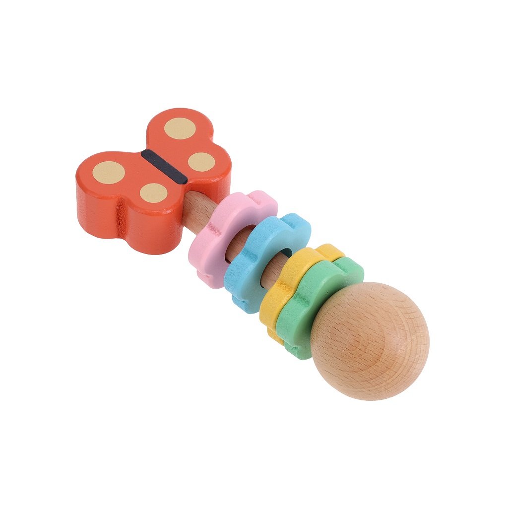 Třes, třes, třes! Barevné chrastítko se čtyřmi prsteny vydává při jemném otřesu veselý zvuk. Vyrobeno z bukového dřeva.