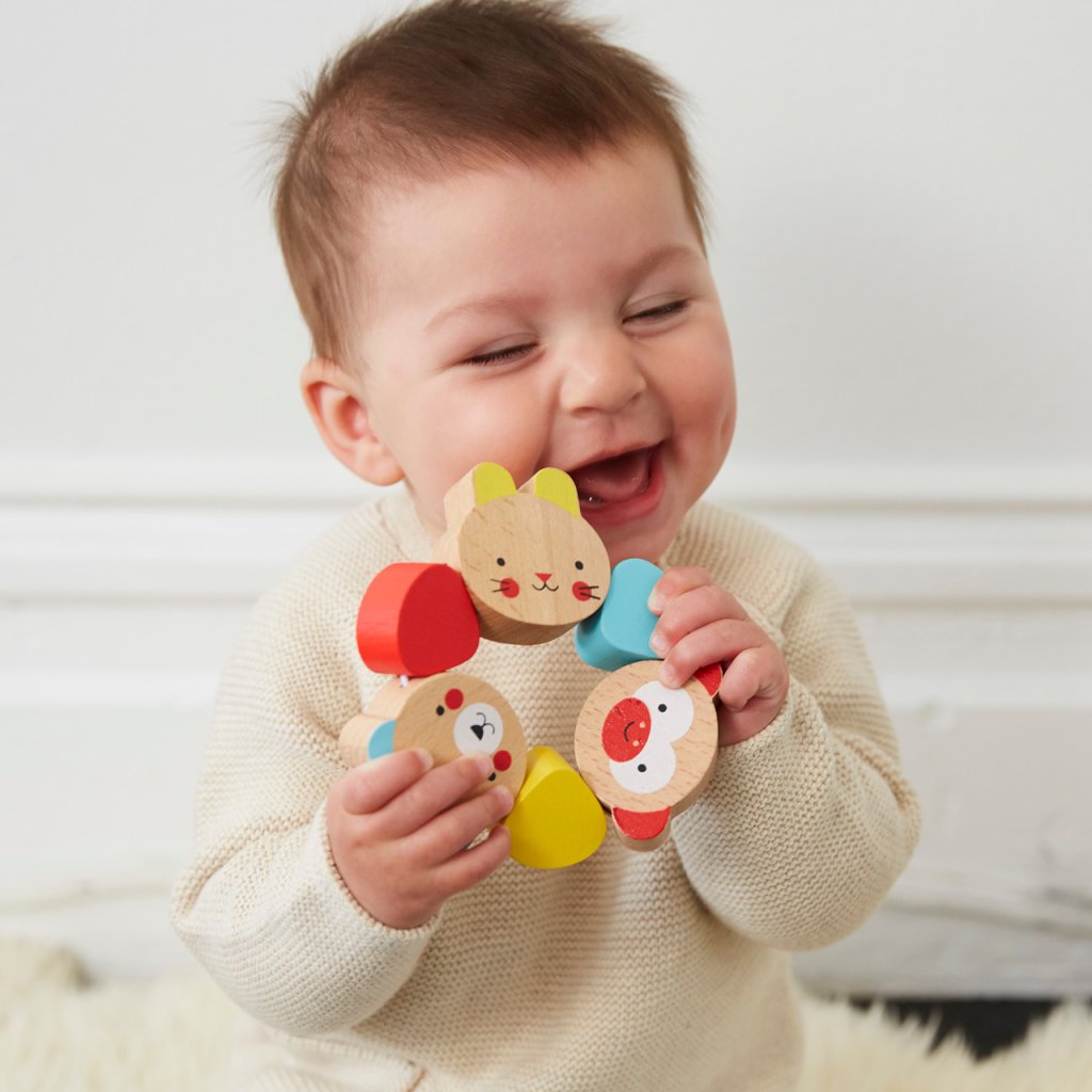 Kousátko, které je ideální pro novorozence, kteří neudrží ruce chvíli v klidu! Obsahuje šest dílků z pevného dřeva, z toho tři vykreslují milé tváře zvířátek, tři mají tvar barevných kapek. Jsou spojeny pevnou plastovou šňůrkou, vydrží i to nejpevnější sevření.