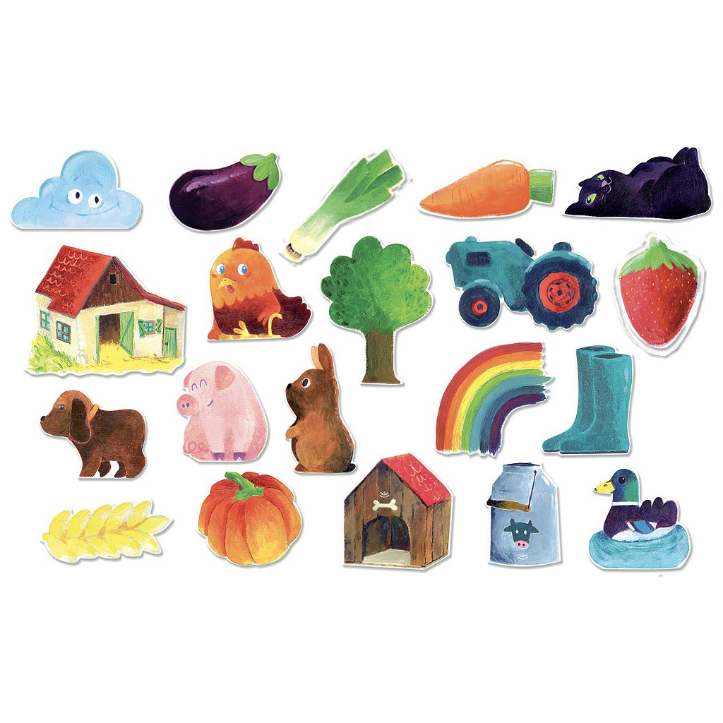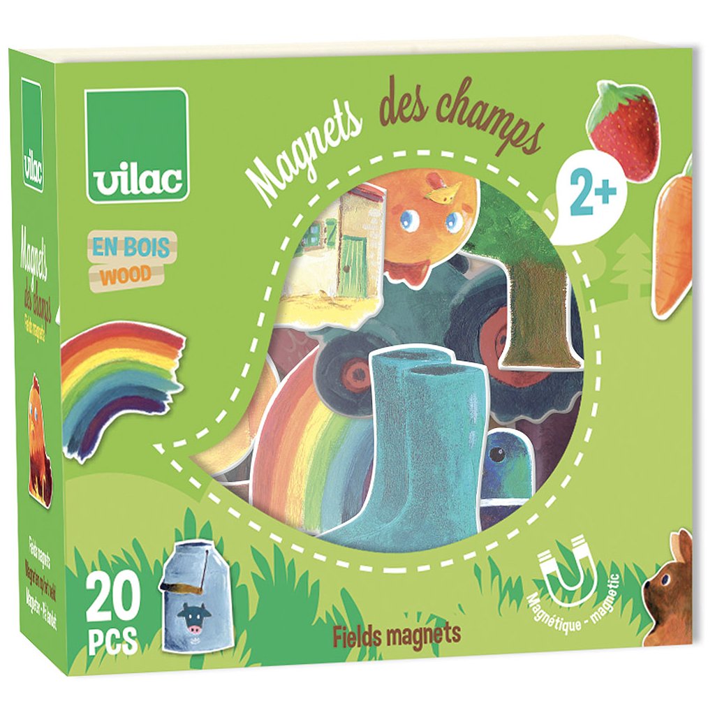 Objevte kouzlo života na venkově s touto sadou 20 dřevěných magnetek od značky Vilac. Najdete mezi nimi klasické motivy inspirované přírodou, hospodářskými zvířaty i venkovským prostředím. Magnetky mohou děti využít při hře na lednici, magnetické tabuli nebo si s nimi ozdobit svůj pokojíček.