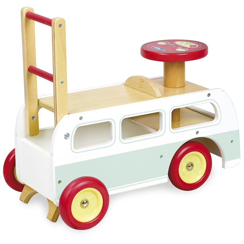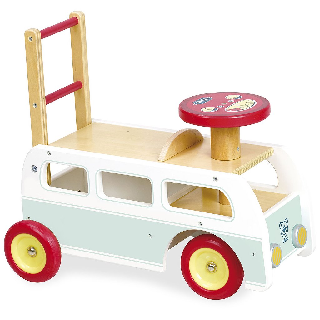 Toto dřevěné odráželo minibus je chodítkem a odrážedlem v jednom. Díky stabilní konstrukci a systému proti překlopení je ideální pro první krůčky i samostatnou jízdu. Pogumovaná kolečka zajišťují tichý a plynulý chod, takže se hodí i na pevné podlahy. Děti si navíc zamilují funkční volant, kterým ovládají směr jízdy, a praktický úložný prostor ten je jako stvořený na převážení oblíbených hraček nebo plyšáků.