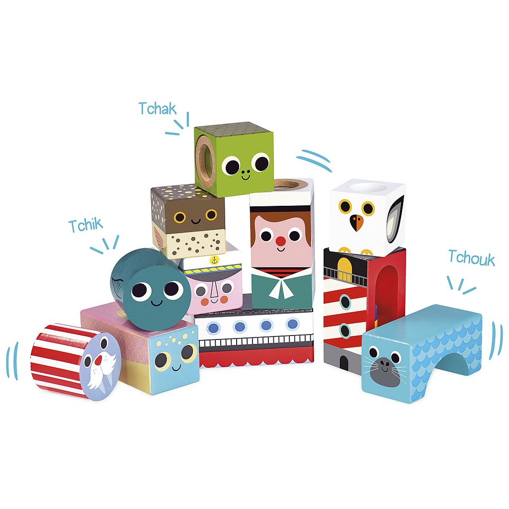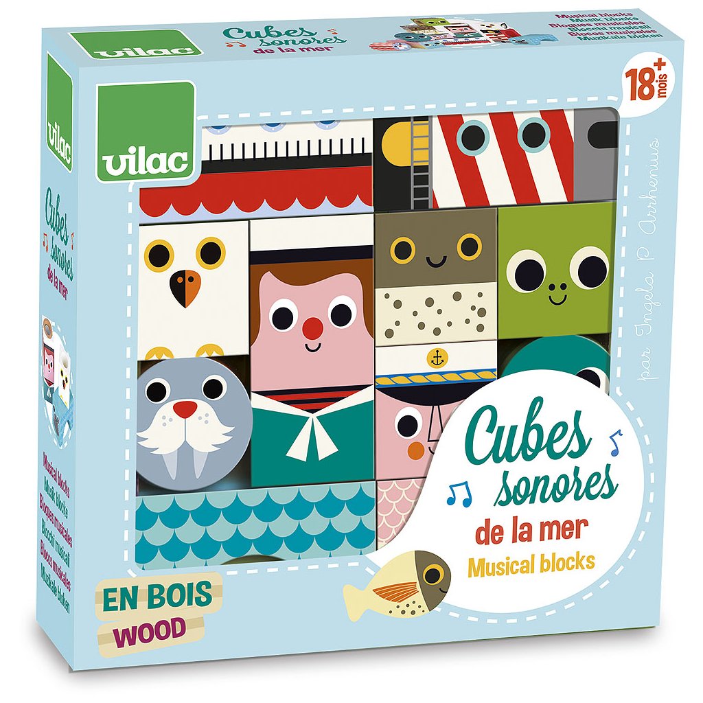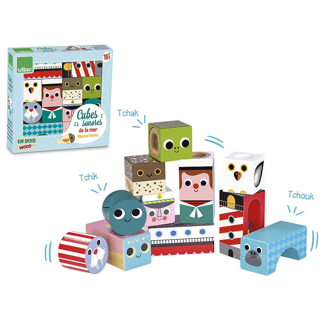 Objevujte svět tvarů, barev a zvuků! Jedenáct dřevěných kostek s motivy moře od ilustrátorky Ingely P. Arrhenius zabaví děti na dlouhé hodiny. Každá kostka skrývá jiný zvuk, takže hračka nejen rozvíjí motoriku a koordinaci, ale také probouzí zvídavost a smyslové vnímání.