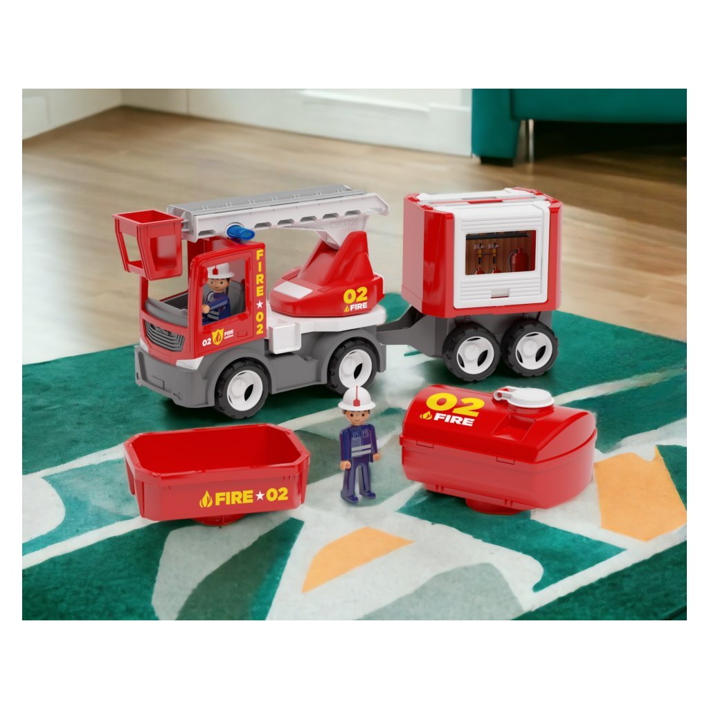 • MultiGO Fire set obsahuje: tahač, 4 vyměnitelné nástavby: hasičský žebřík, cisternu, valník, hasičskou skříňovou nástavbu s hasičským vybavením, přívěs a dvě figurky Igráčky hasiče.