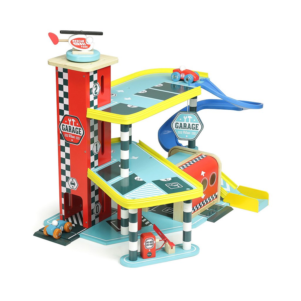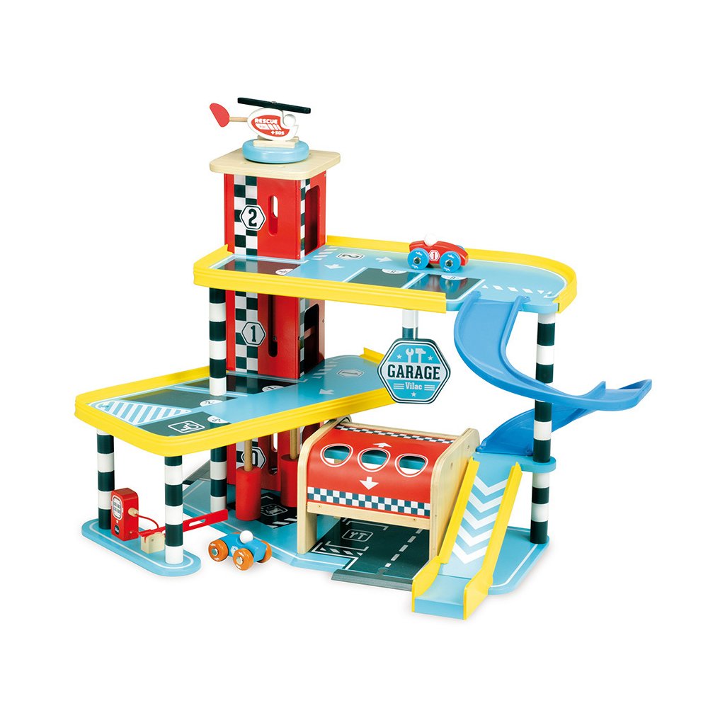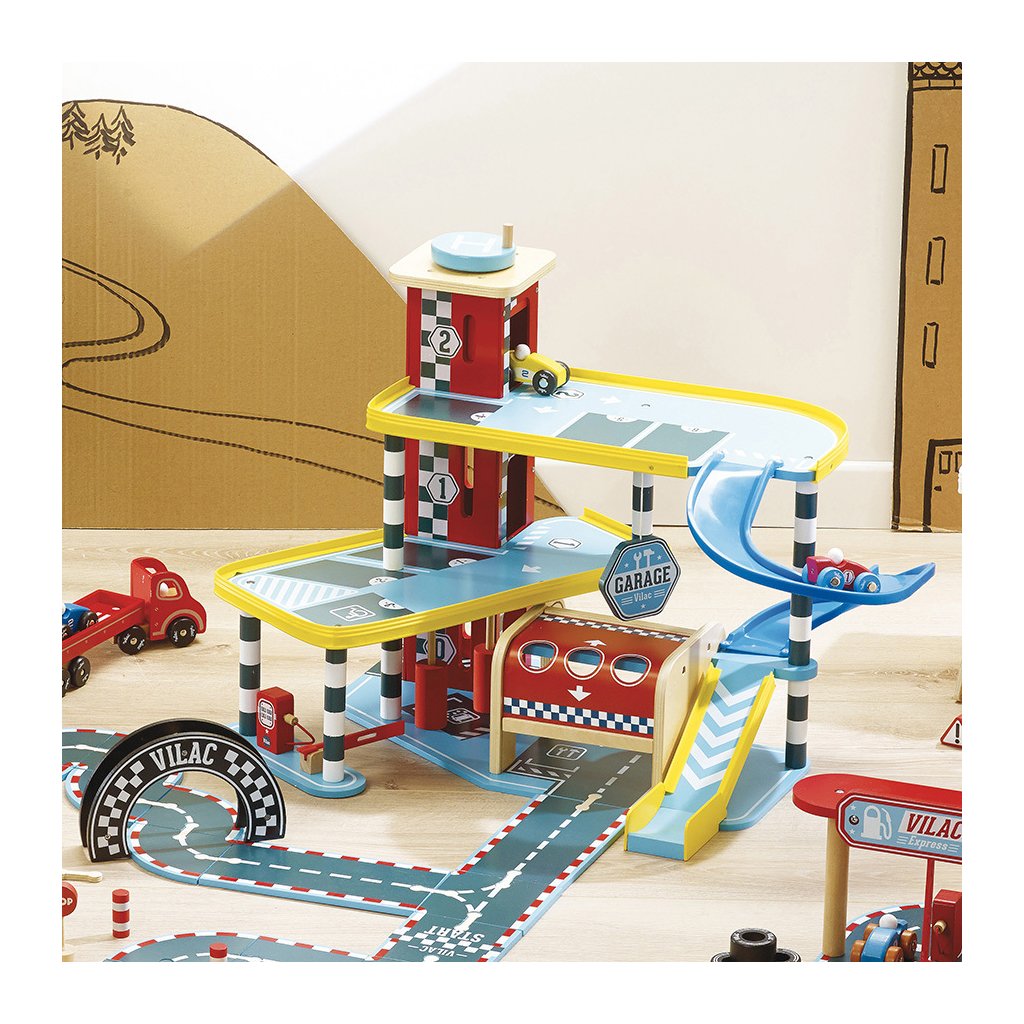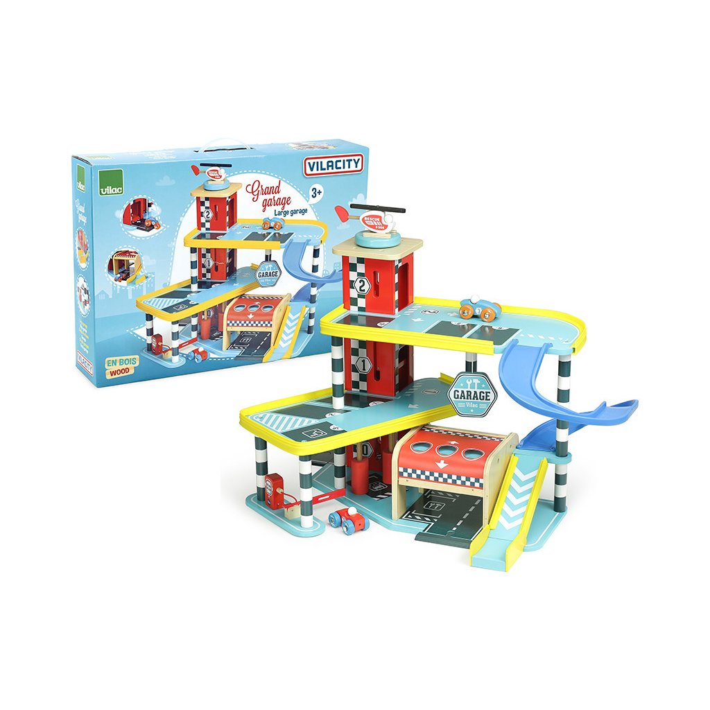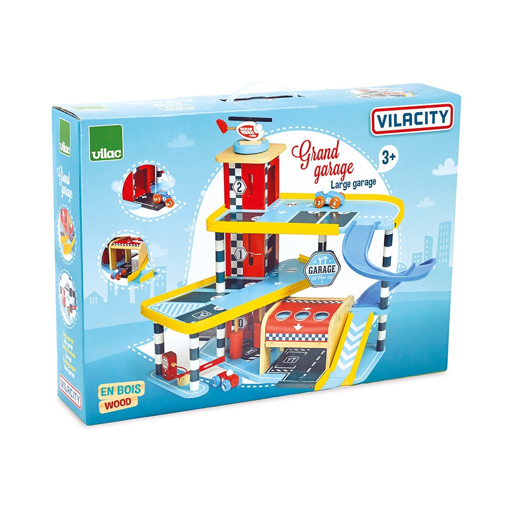 Velká garáž s rampou, která nabízí množství mechanických detailů, zejména výtah, zatahovací dveře, parkovací závoru, ale i čerpací stojan, či mycí kartáče. Její součástí je také dvojice autíček a helikoptéra. Garáž je součástí Vilacity kolekce a je se všemi jejími součástmi plně kompatibilní, další samostatná rozšíření přinesou variabilitu a prohloubí zážitek ze hry. Výrobek vyžaduje montáž, dodáváno s detailním návodem k sestavení.