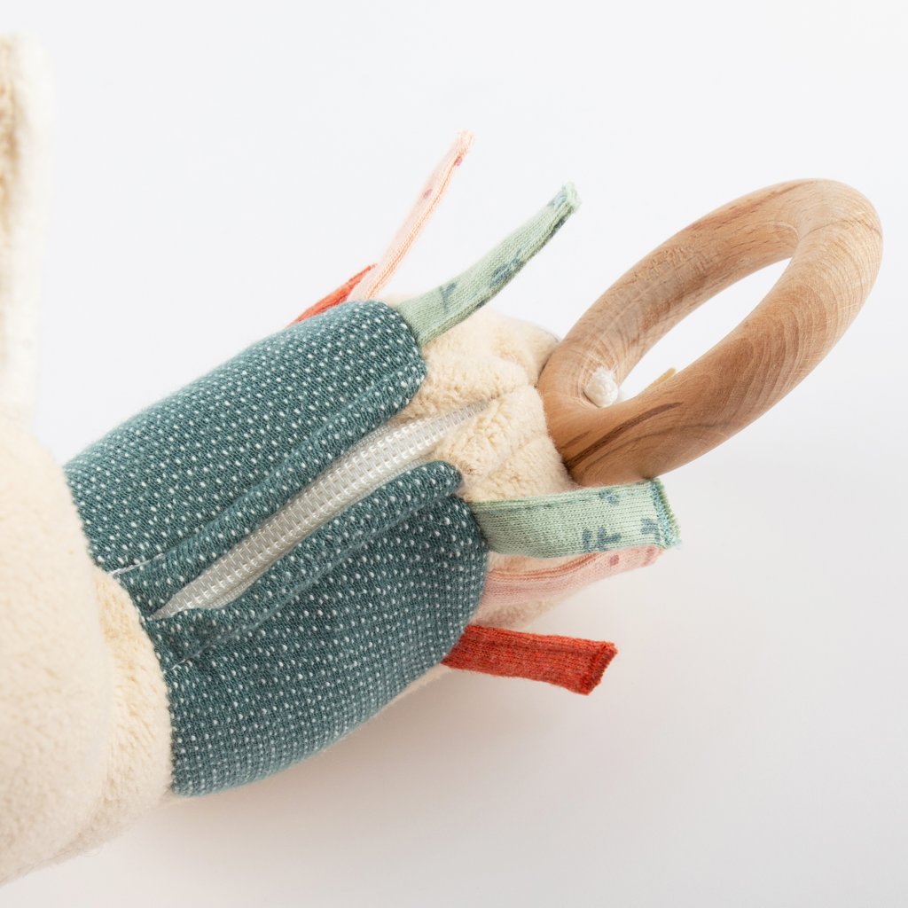 Hudební mechanismus s náhodně vybranou ukolébavkou (z pěti různých). Lze spustit zatažením za šňůrku. Stužky a ouška na hraní, uchopení a žužlání.