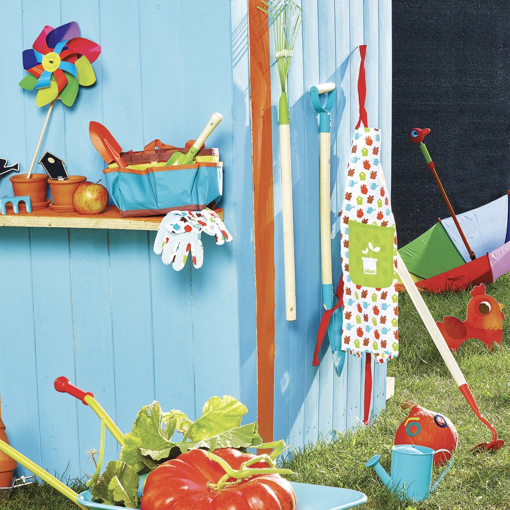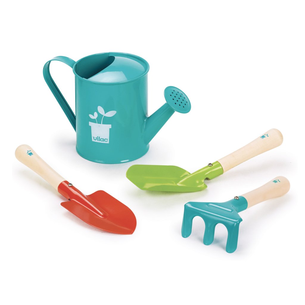 Přenosný set pro malé zahradníky! Tento přenosný set obsahuje všechno, co je potřeba k práci na zahradě: lopatku, hrábě, rýč a konvičku. Vše je uloženo v praktické látkové tašce, kterou lze snadno vyprat. Nářadí je vyrobeno z masivního dřeva a kovu, velikostně tak akorát pro dětské ruce.