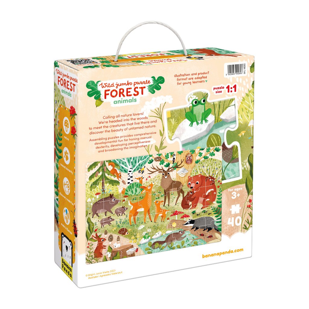 Wild Jumbo Puzzle Forest Animals podporuje koordinaci ruky a oka, trénuje trpělivost, soustředění a logické myšlení. Pomáhá dětem rozpoznávat tvary, barvy a zvířata.