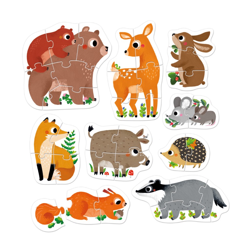 Sada Forest Animals obsahuje 9 samostatných velkých puzzle s různým počtem dílků, což dětem umožňuje postupně zdokonalovat své dovednosti.