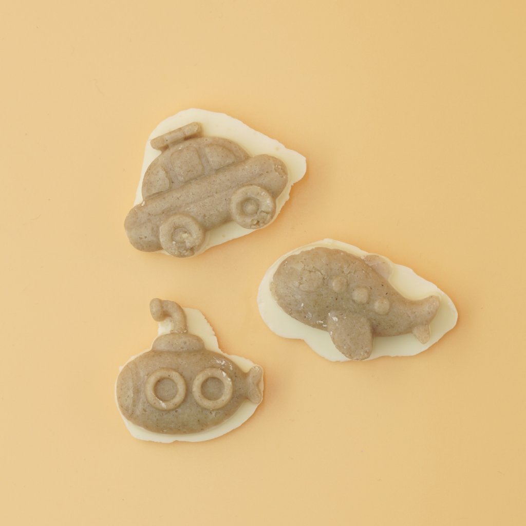 Tři kousky mini Liluk ve tvaru dopravních prostředků s oblíbenou kokosovou náplní a bílou čokoládou