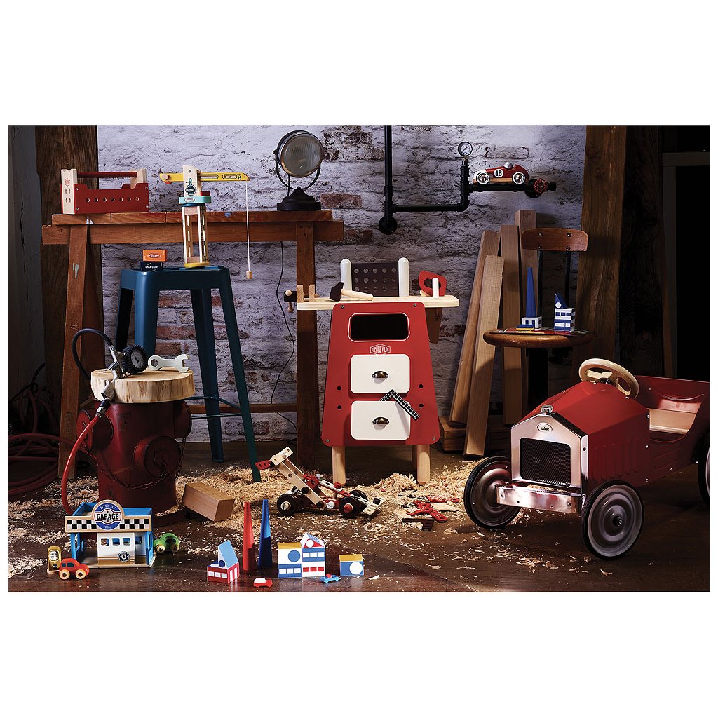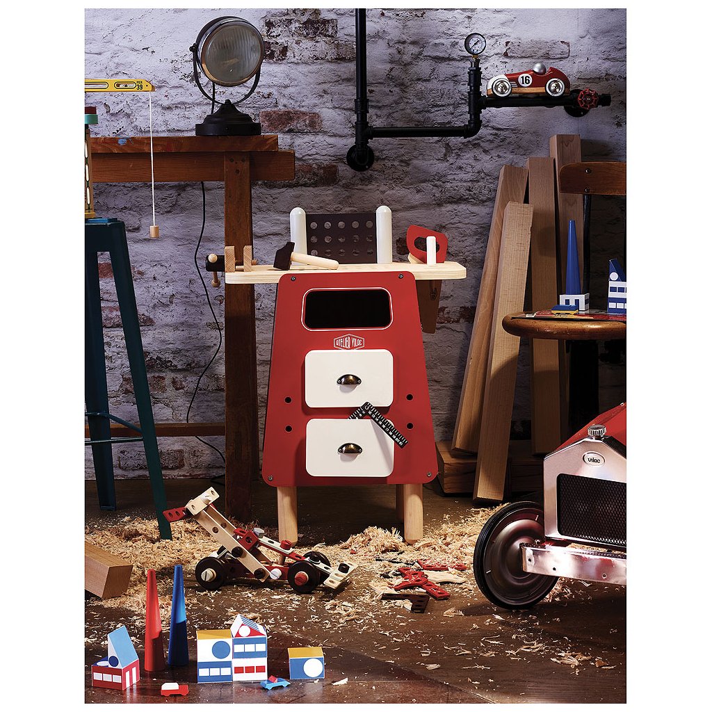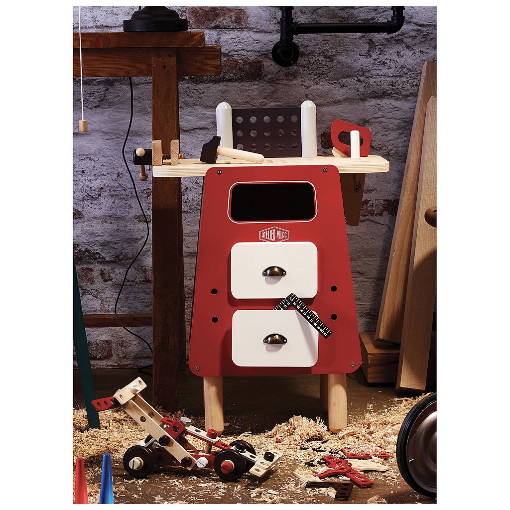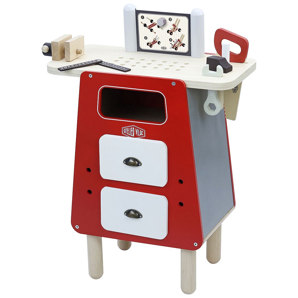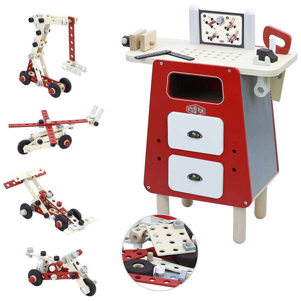 Tento originální dřevěný pracovní ponk s vintage vzhledem dětem umožňuje tvořit stejně jako dospělí. Magická pracovní deska, která drží pohromadě díky suchému zipu, umožňuje dětem řezat dřevo bez rizika úrazu. Kladivem zaklepou dětské dřevěné hřebíky. Šroubovákem a klíčem věci smontují a opět rozmontují dle gusta. Představivost, trpělivost a vynalézavost. Nechte talent nejmenších zářit! Oboustranný kufr s nářadím od Ateliéru Vilac.