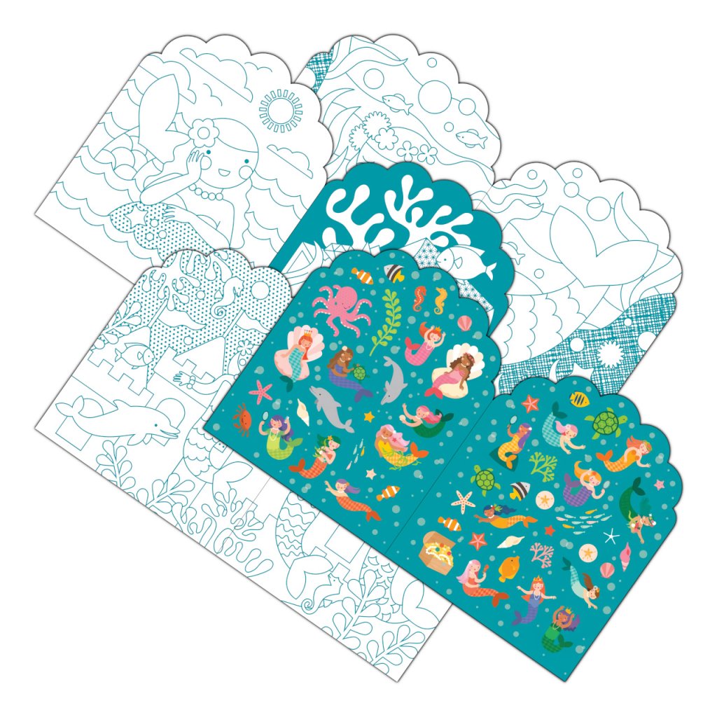 Připravte pastelky! Omalovánky Mermaids lze po vybarvení dozdobit některými z velké sady přibalených pestrobarevných samolepek mořských víl, živočichů a podmořského světa. Jednoduché roztomilé tvary děti nadchnou a rozjitří jejich fantazii. Vyrobeno z udržitelně získaného papíru.