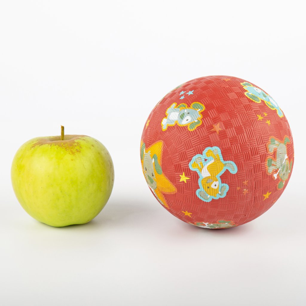 S průměrem 12 cm a velmi přilnavým povrchem je tento míč ideálním prvním hracím míčem pro děti od jednoho roku. Má dětsky přívětivý design – jasně červená barva, roztomilí pejsci a potisk s hvězdičkami přinášejí do hry barvy a radost. Vyroben ze 100% přírodního kaučuku – přírodního materiálu, který se při chladu smršťuje a při teple roztahuje. Míč by proto neměl být dlouhodobě vystavován přímému slunci. Při nafukování je nutné dodržet uvedenou maximální velikost, jinak může dojít k deformaci míče. Míč může zpočátku mít typický zápach přírodního kaučuku, který časem vyprchá. Neobsahuje PVC, BPA ani vinyl – je tedy zcela zdravotně nezávadný. Dodává se již nafouknutý.
