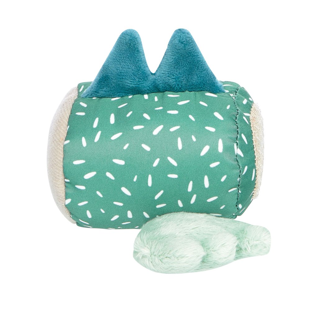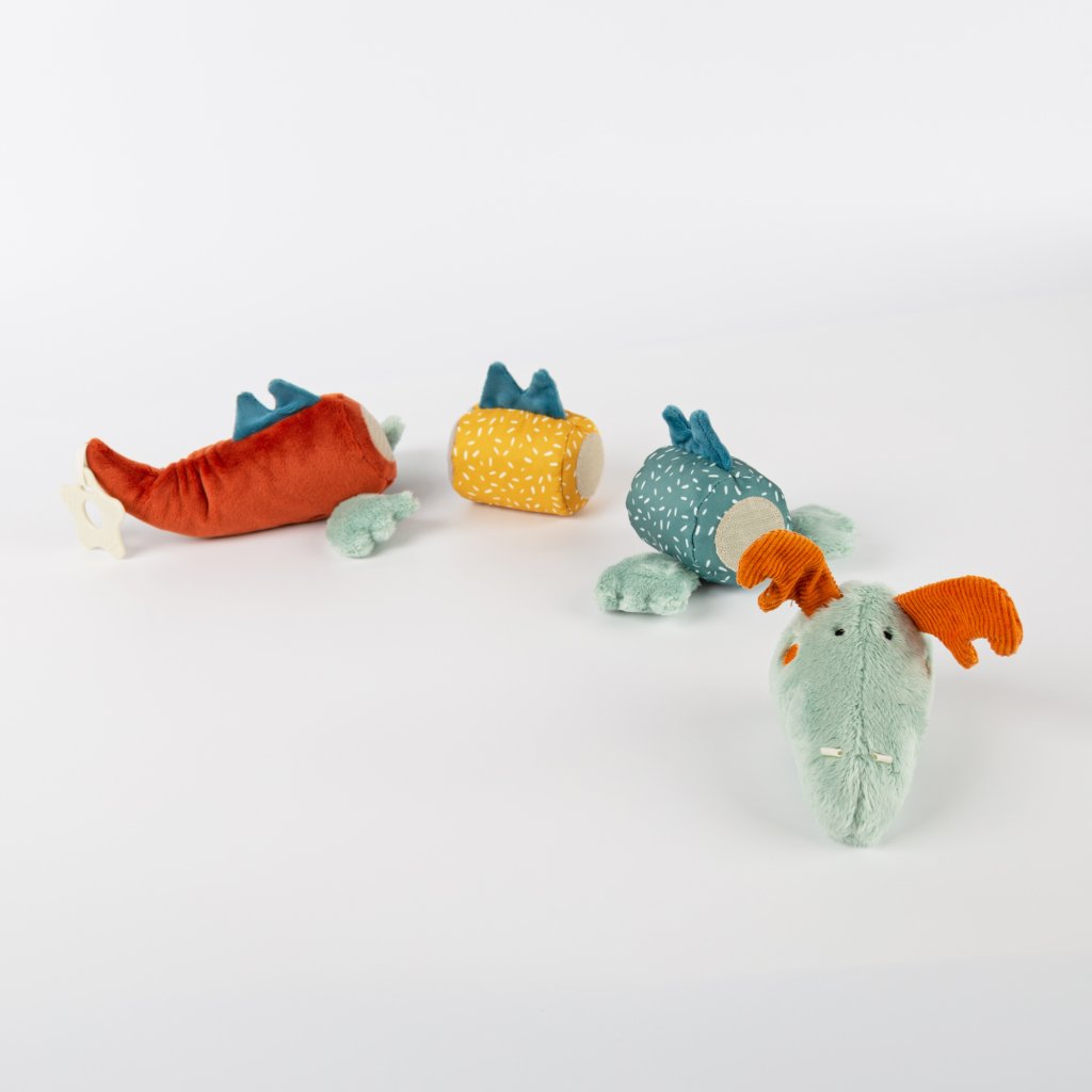 Hračky mají praskající folii, pískátko a chrastítko, které děti motivují k objevování různých zvuků a textur. Velcro drak má také kousátko pro miminka, které pomáhá při prořezávání zoubků.