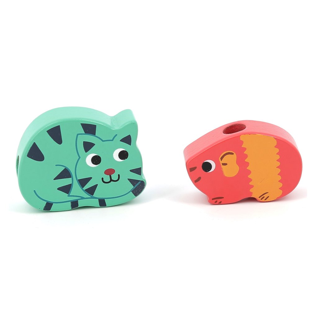 Krásná provlékačka s motivy zvířátek. V kompaktním balení najdete 12 ilustrovaných dřevěných korálků (např. kočka, myš, králík, žába), které děti mohou navlékat na textilní šňůrku. Hračka pomáhá s rozvojem jemné motoriky. Vybaveno bezpečnostními sponami. Vhodné od 18 měsíců.