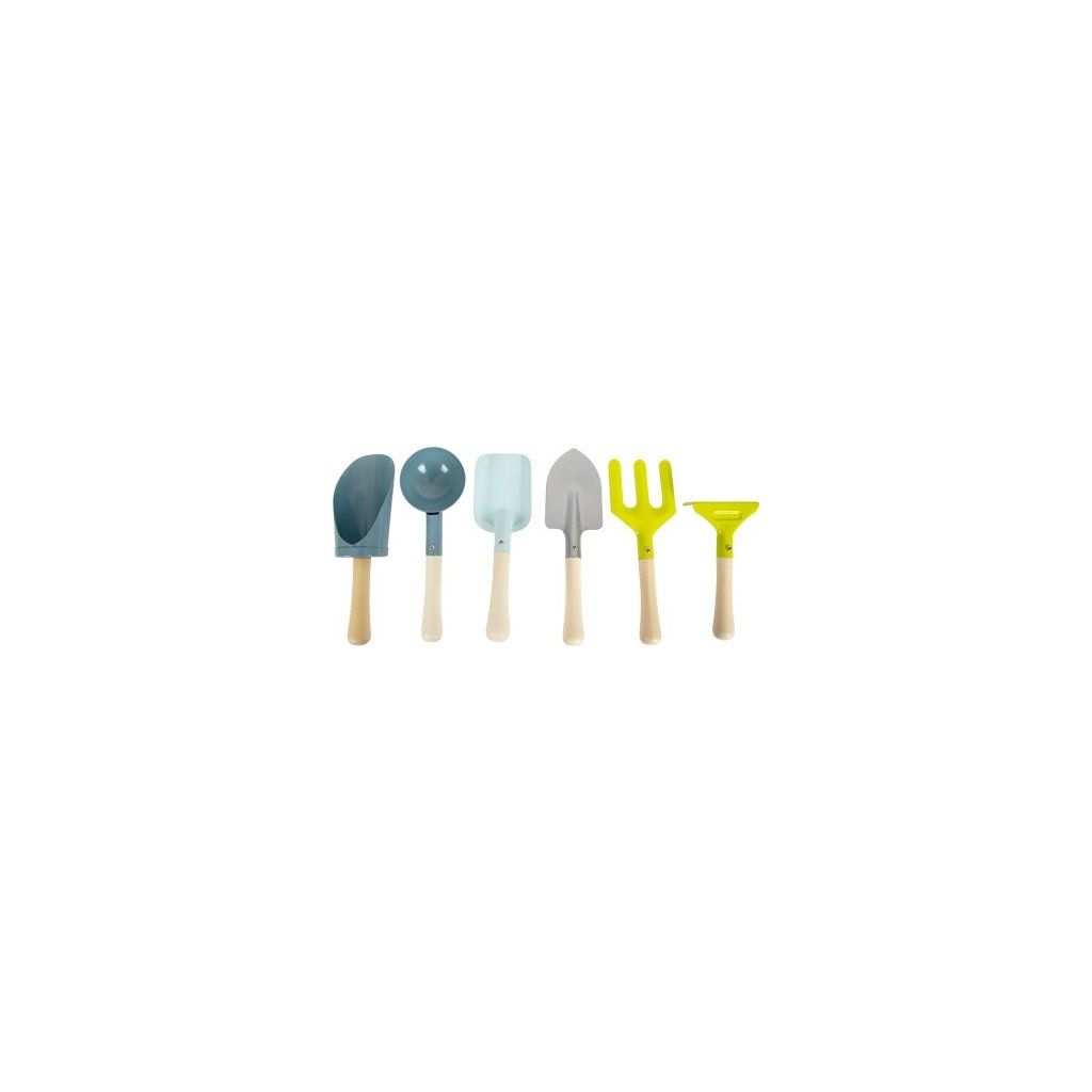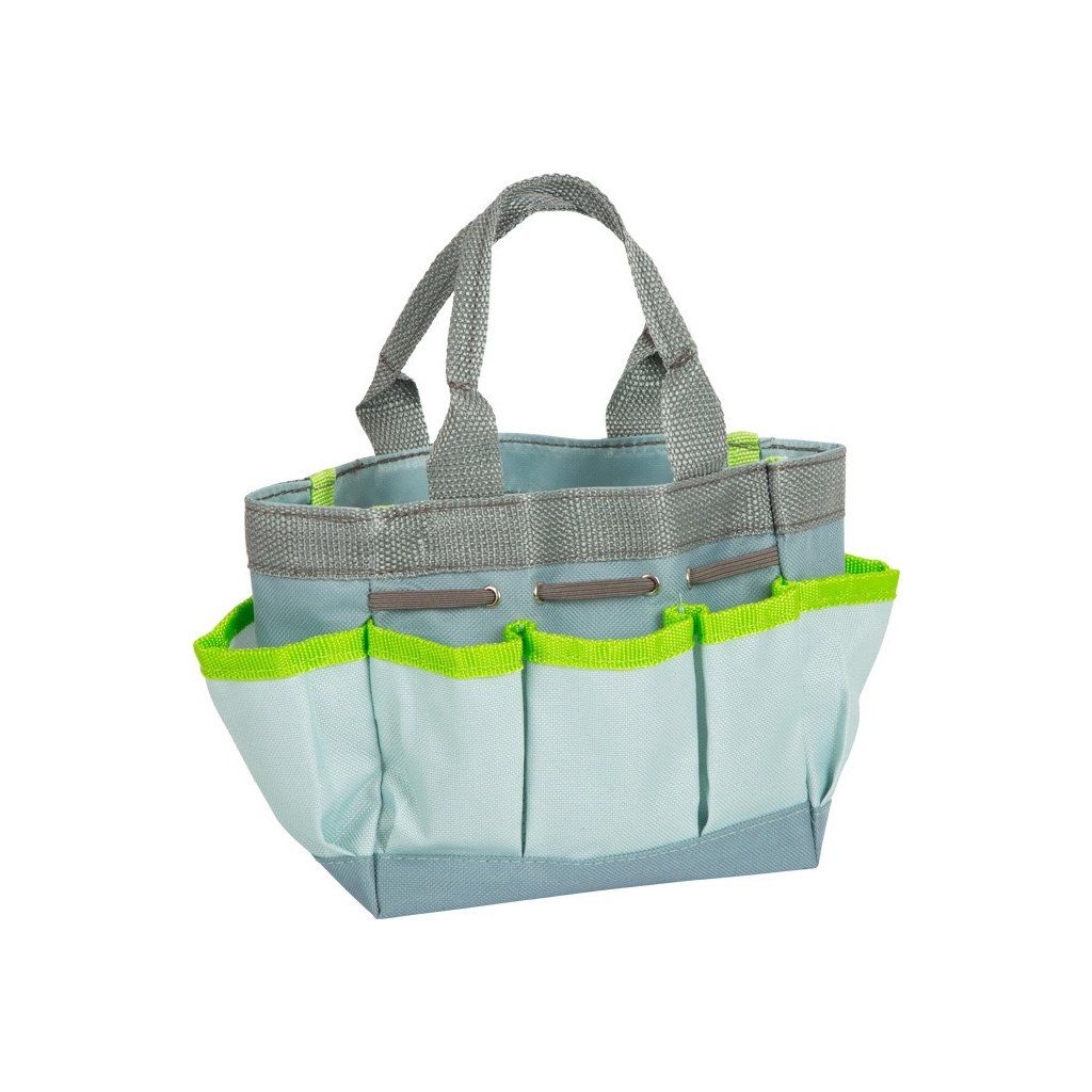 Tato praktická zahradní taška je skvělým pomocníkem na zahradě a je ideální pro snadnou přepravu veškerého zahradního nářadí. Šest různě tvarovaných nástrojů z robustního kovu v módních barvách s rukojetí z přírodního dřeva láká k zahradním aktivitám! Lopatku na smetí, lopatku na uhlí, ruční rýč a naběračku, stejně jako malé hrábě a vidle, lze snadno uložit do tašky a mít je tak vždy po ruce. Tato zahradnická sada se skvěle doplňuje s lahví rozprašovače, která funguje i jako zalévací konev. Speciálně vyrobeno pro velikost a potřeby malých začínajících zahradníků, ale ideálně se hodí i na pláž a pískoviště! Zahradní taška pro děti nabízí dostatek místa pro veškeré nářadí díky četným bočním kapsám s upevňovacími gumičkami na nářadí – kopání, sázení a sklízení může být zábavné!