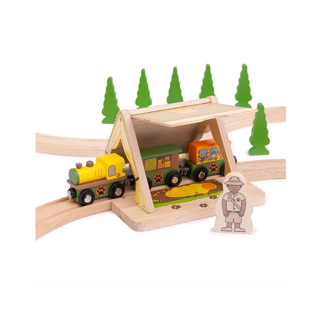Zábavný doplněk každé dřevěné vlakové soupravy a skvělý způsob rozšíření Safari vláčkodráhy (BJT069). Snadno se připojí k další dřevěné vláčkodráze a příslušenství. Skládá se ze 2 kusů - stanu a strážce parku. Splňuje aktuální evropské bezpečnostní normy. Součástí balení není vláček, zvířata ani stromy.