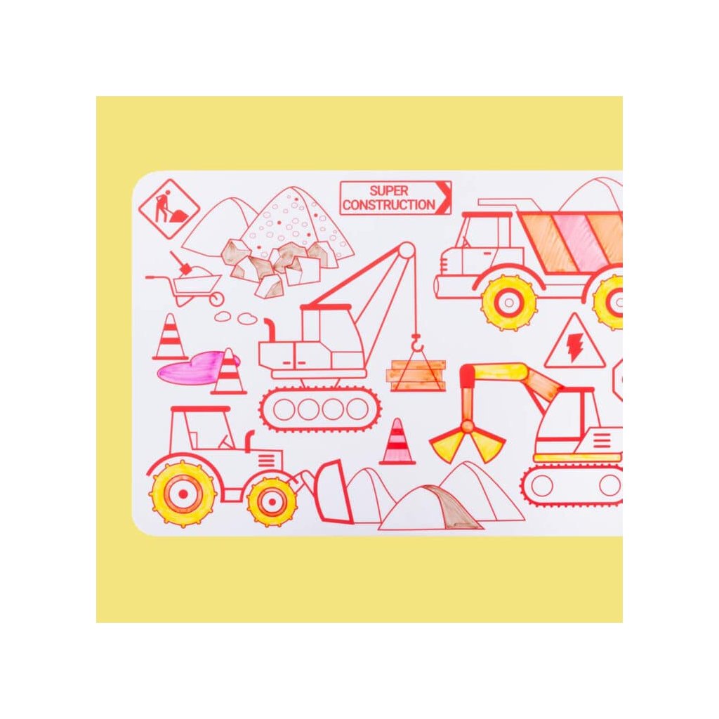 Jedna strana podložky Mini Play Mat Super Construction má zábavný motiv stavby, který si dítě může vybarvit. Druhá strana je prázdná a slouží k volnému kreslení. Díky omyvatelným fixům je možné podložku kdykoliv otřít a používat znovu.