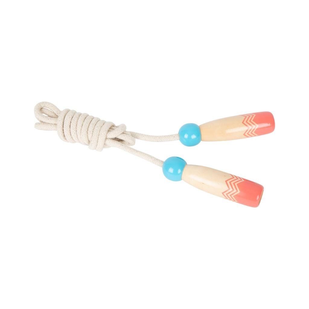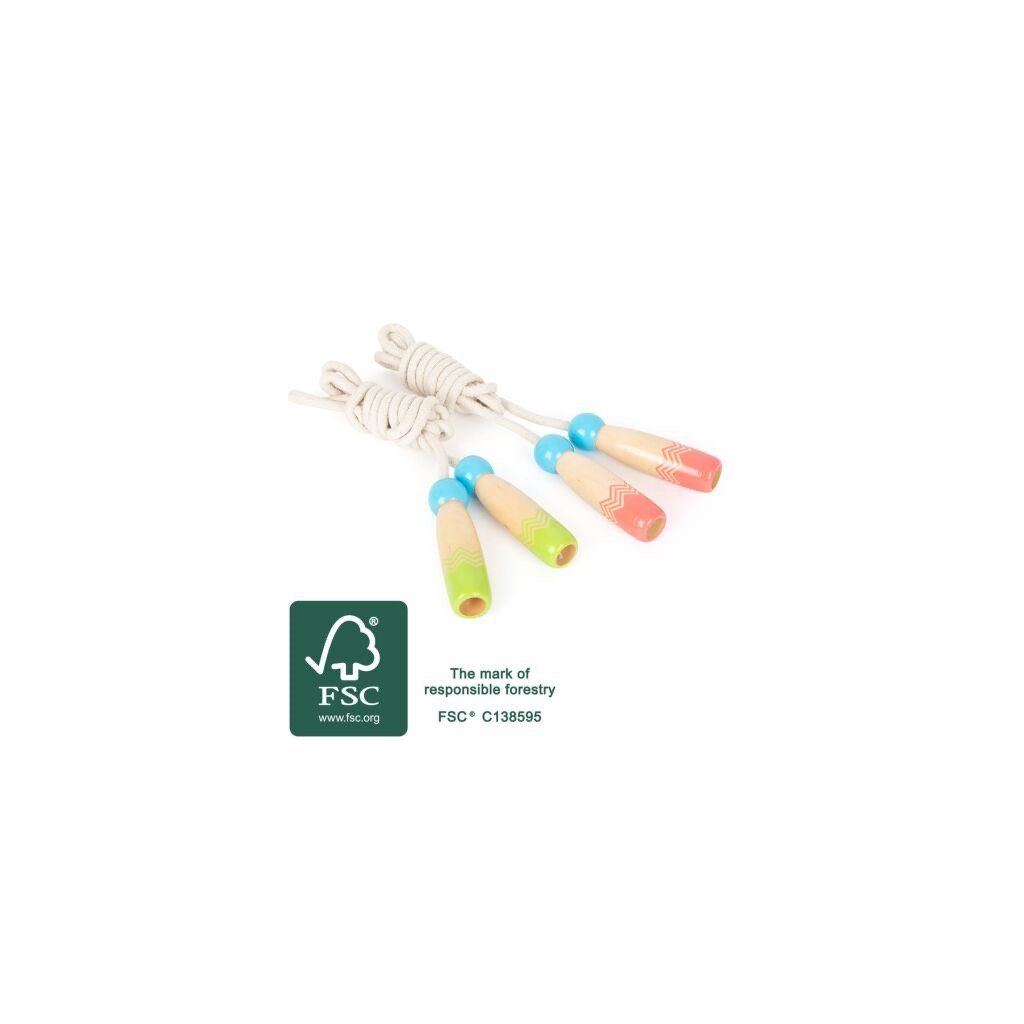 S tímto odolným švihadlem si děti užijí akční zábavu. Během přeskoků si děti mohou vybít přebytečnou energii a zároveň procvičit svou zručnost, sílu a výdrž. Zaoblená madla jsou vyrobena ze 100% certifikovaného FSC® dřeva, lze je jednoduše uchopit, mají velikost tak akorát pro děti. Délka lana se dá nastavit pomocí uzlů v madlech. Madla švihadla mají zelený a růžový potisk. Klasická hračka i cvičební pomůcka, kterou si děti užijí uvnitř i venku.