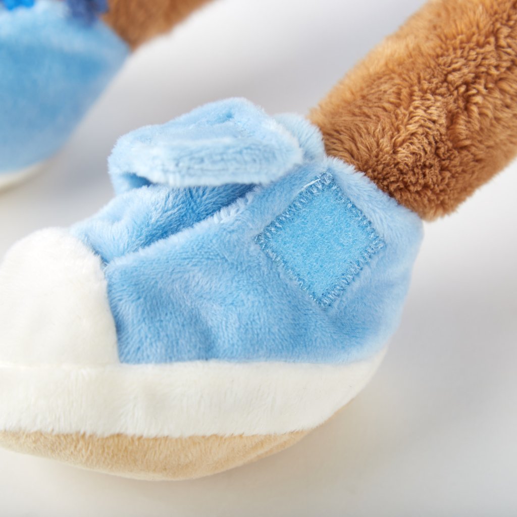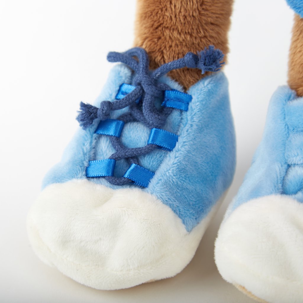 Tato funkce čeká na to, až ji malé ruce ovládnou: zip na červené bundě, šňůrka na kapuci, knoflíky na manžetách, patentek na modrých kalhotách, tkaničky a suchý zip na botách. Puntíkovaný šátek je pevně přišitý, aby se předešlo jeho spolknutí. Tento přibližně 43 cm vysoký mazlík je doporučen pro děti od 12 měsíců. Je úžasně měkký a nabízí vašemu malému sluníčku skvělou herní hodnotu – podobně jako panenka, kterou si děti mohou vzít i do postele na mazlení a usínání. Černé plastové oči jsou připevněny na zadní straně pomocí zajišťovacích disků. Pro potvrzení připojení je proveden test tahem. Tento test zahrnuje tahání po dobu 10 sekund za použití tažného zařízení, aby se ověřilo správné připojení. Všechny materiály jsou vysoce kvalitní a odolávají častému praní na 30 °C při šetrném programu.