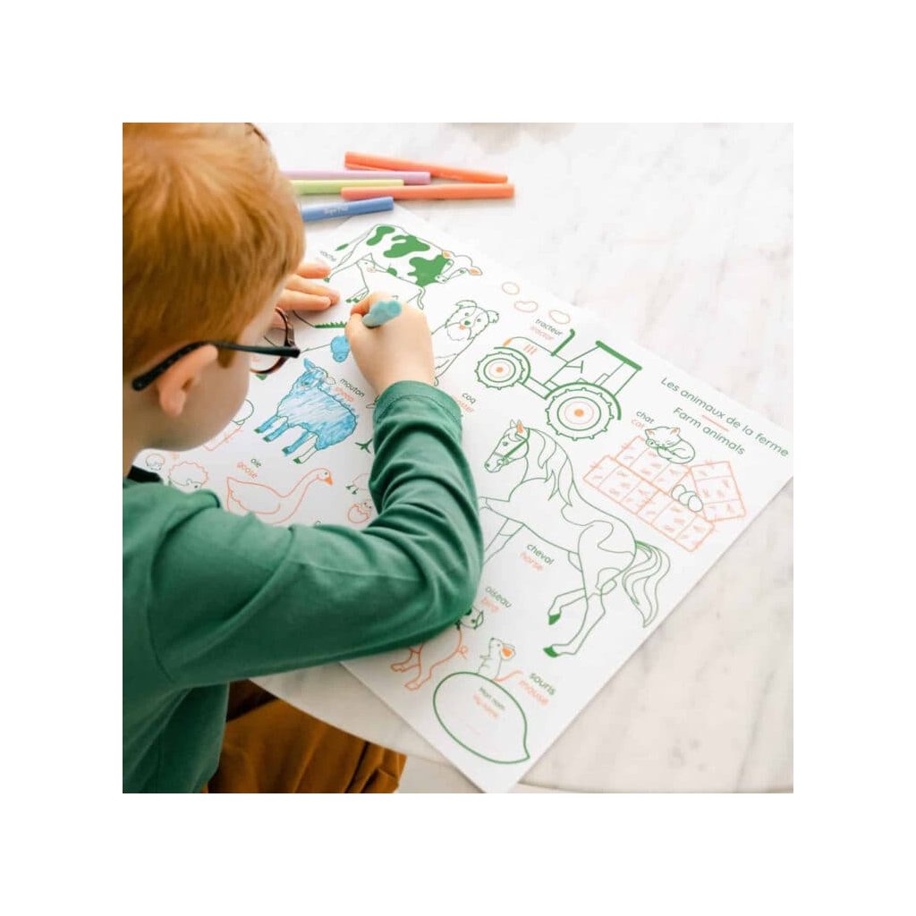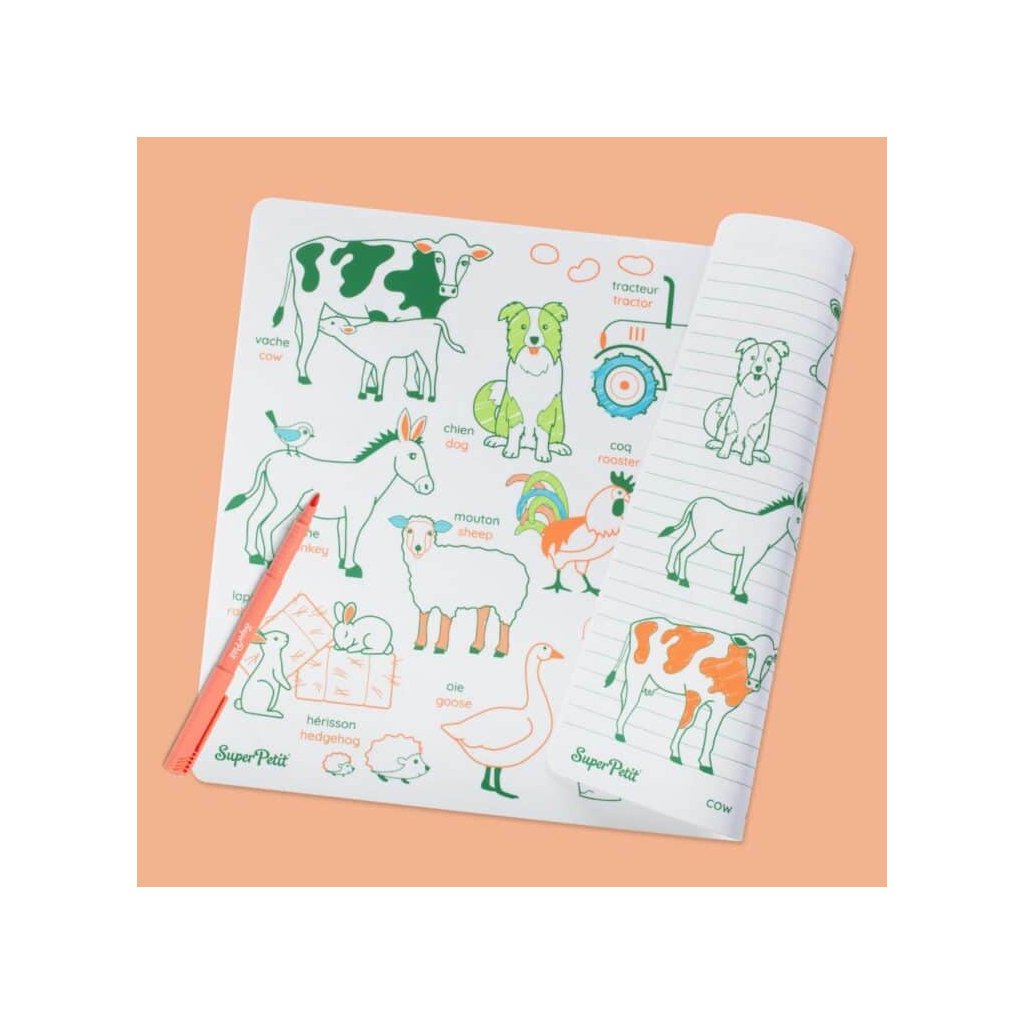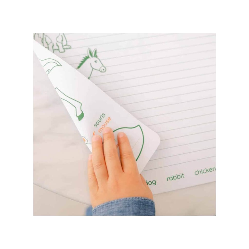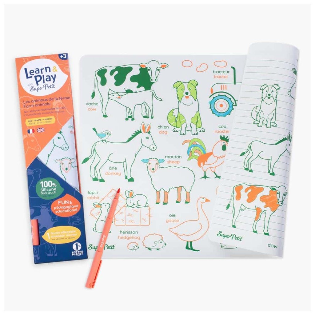 Děti vybarvují zvířata na farmě a přitom se učí jejich jména. Podložka z kolekce Learn & Play je oboustranná – jedna strana s ilustracemi, druhá linkovaná pro vlastní tvorbu. Stačí fixu setřít vodou a děti mohou začít znovu.