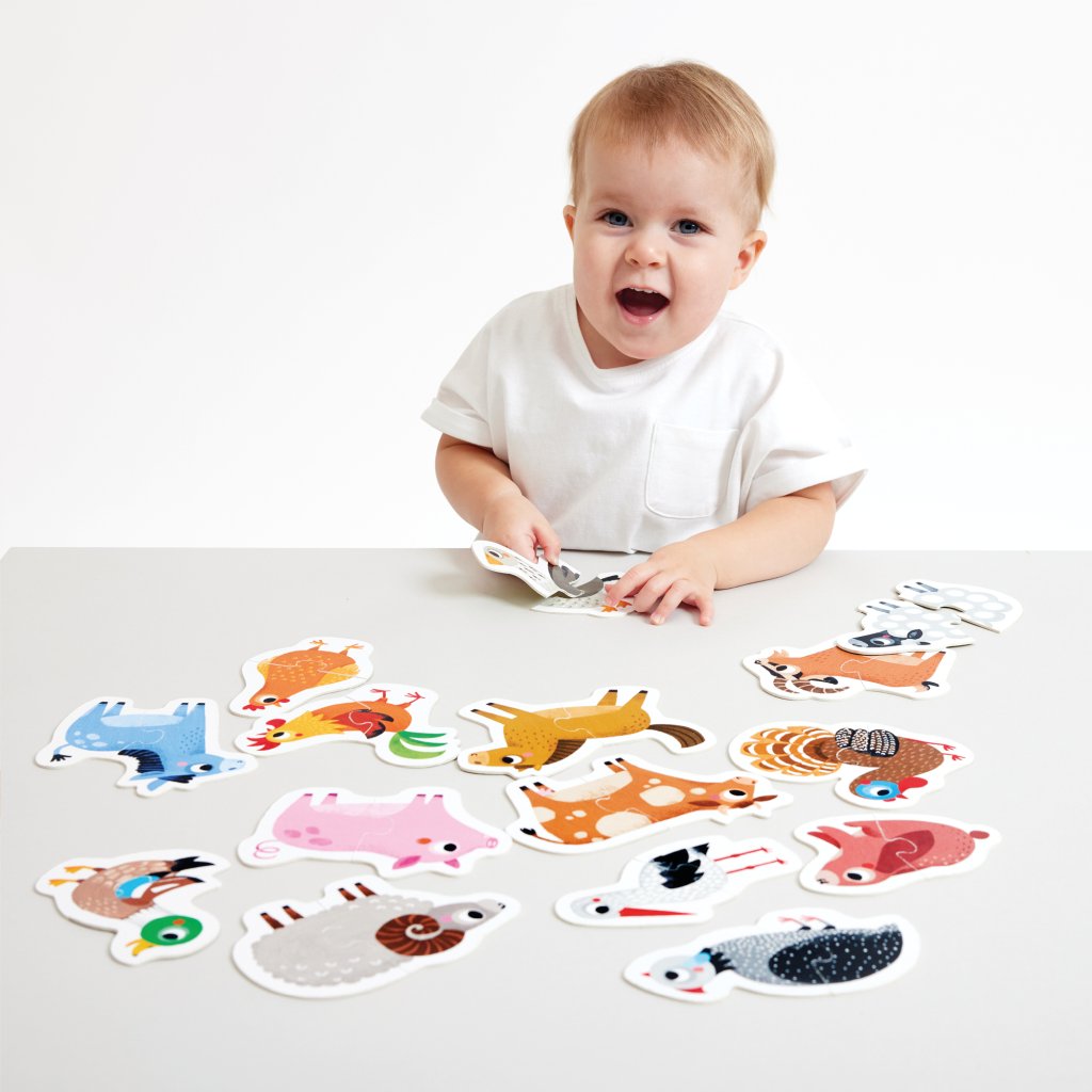 Sada obsahuje 15 velkých samostatných puzzle se zvířátky, každé složené ze dvou dílků, což je ideální pro nejmenší děti, které se učí skládat jednoduché tvary.